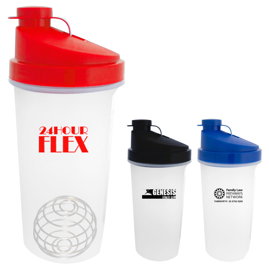 600ml Protein shaker in clear bottle with coloured lid and metal ball.