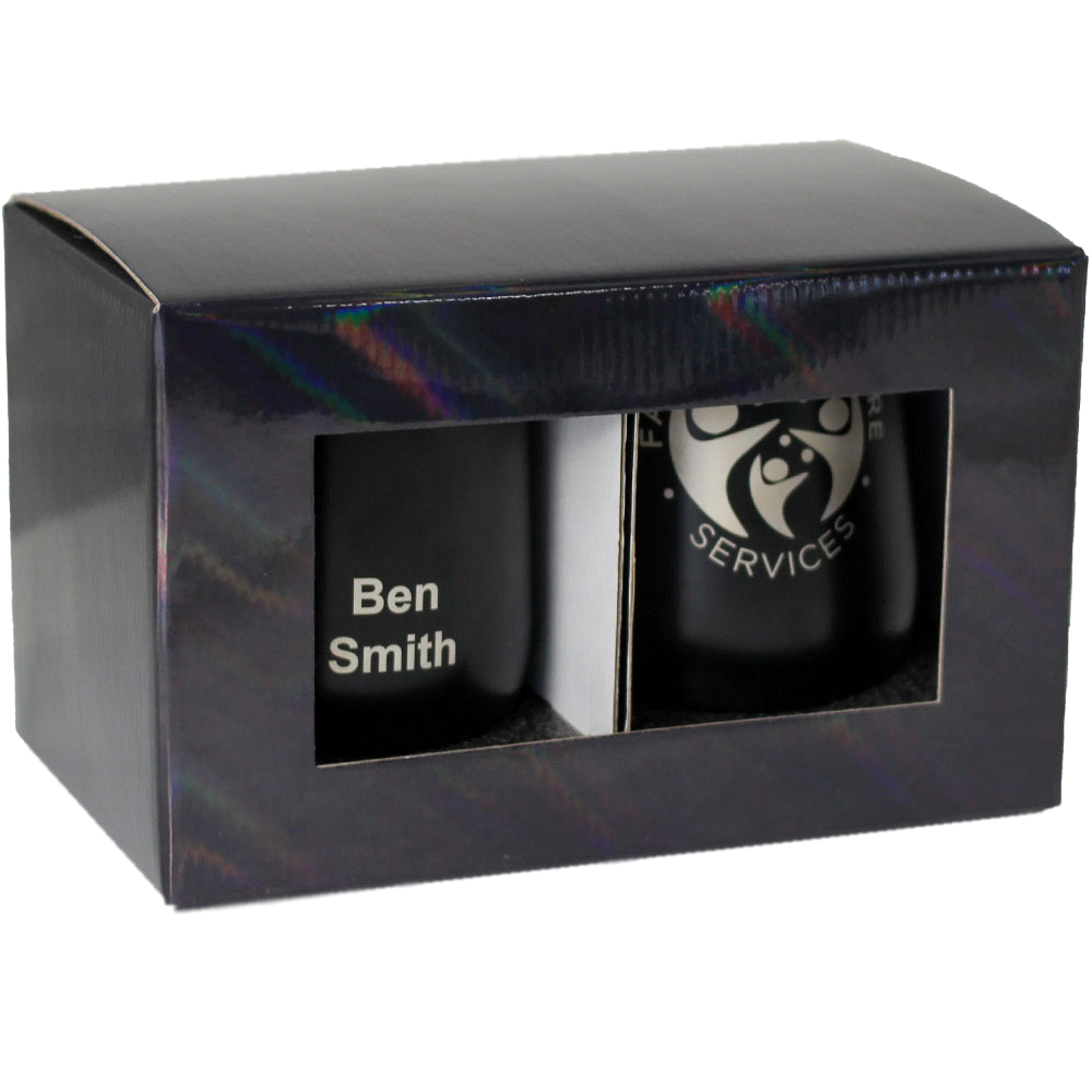 This Gift Box is made to hold 2 pieces of Drinkware. It is suitable for the drinkware items 4078, 4080, 4086, 4090 and 4093 all of which are available separately. This gift box is only available with drinkware from our range and is not sold separately. If the drinkware is being sold undecorated then the gift boxes are delivered flat-packed with some assembly required. Gift boxes and drinkware decorated through our listed decorators will be assembled with drinkware inserted and shipped in shipping cartons with the specifications shown.
