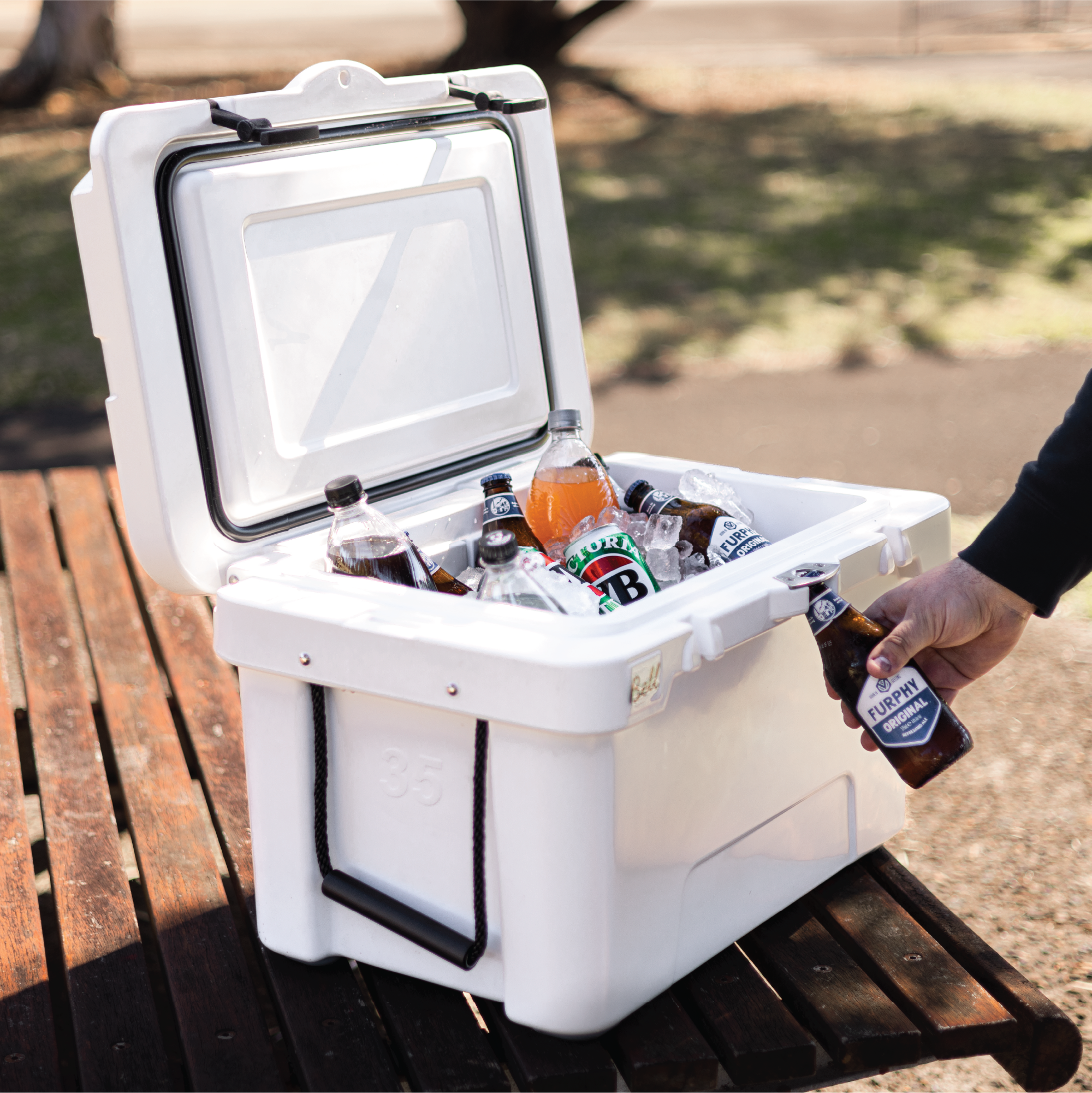 Introducing the 35L BELL Cooler Box for ultimate beverage chilling and brand visibility. Made from Tough Rotomolded Low Density PE with a thick PU foam layer. Colours are UV resistant and will not fade. Strong rope handle with rubber grip. Features a built in bottle opener within the rubber lock. Can hold up to 36 standard 375ml cans with ice on top. Tap on the side to drain out excess water. Designed to keep items inside cold for 3-5 days Sold either unbranded or with digital label.