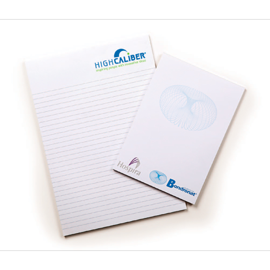 An extremely popular promotional item. Our Note Pads are available in A5. Printed in 4 colour process. The sheets are glued at the head. This range has proved a highly successful and long life promotional product. 50 leaves per pad (with strawboard backing).