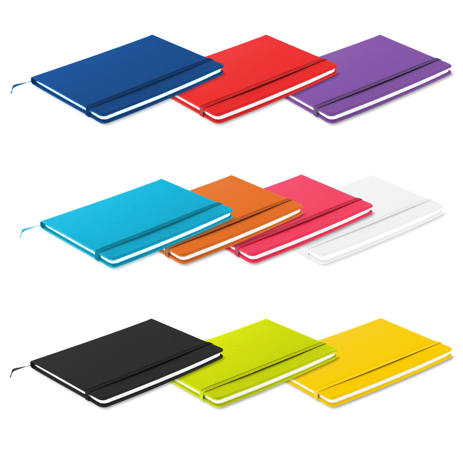A5 size notebook, Best Seller. Wide range of colours available. Features a hard cover with 160 lined pages.