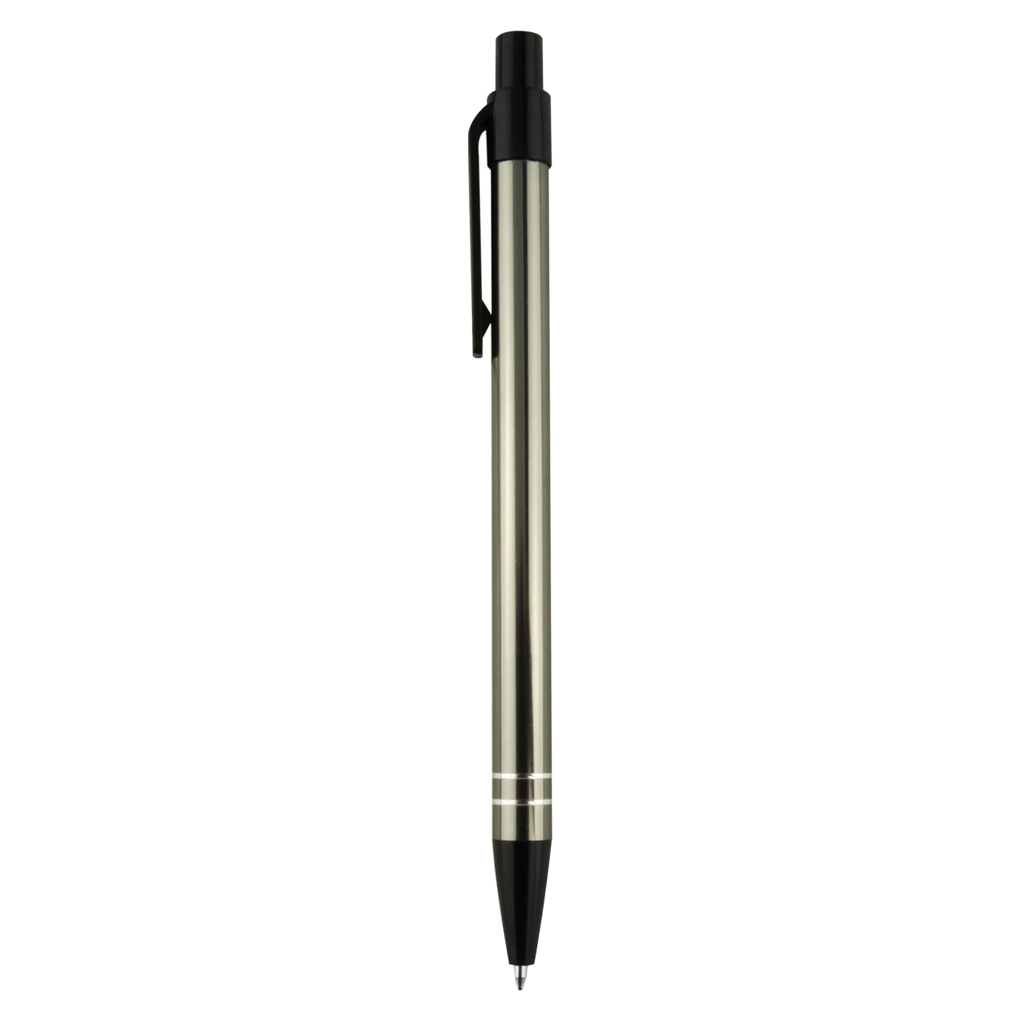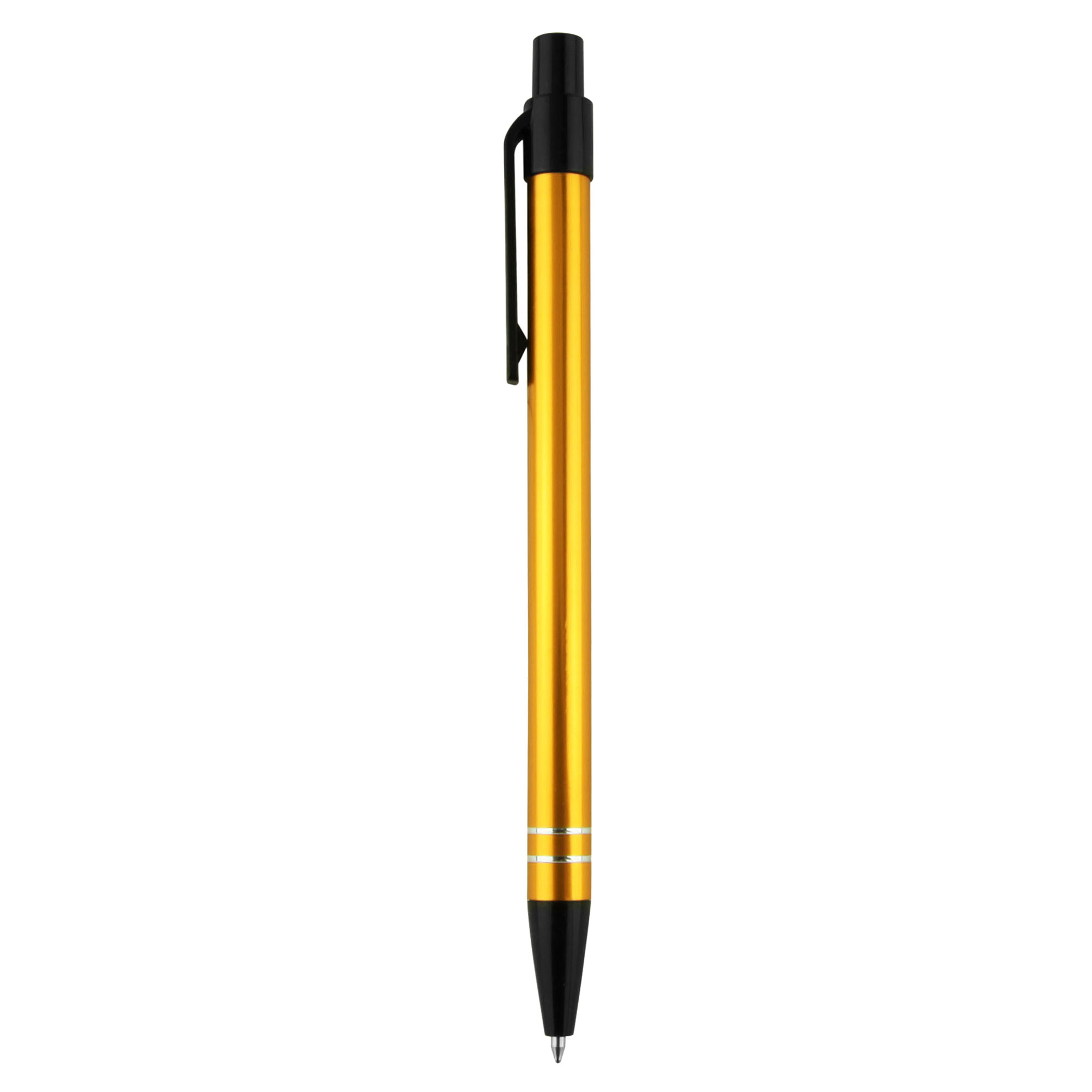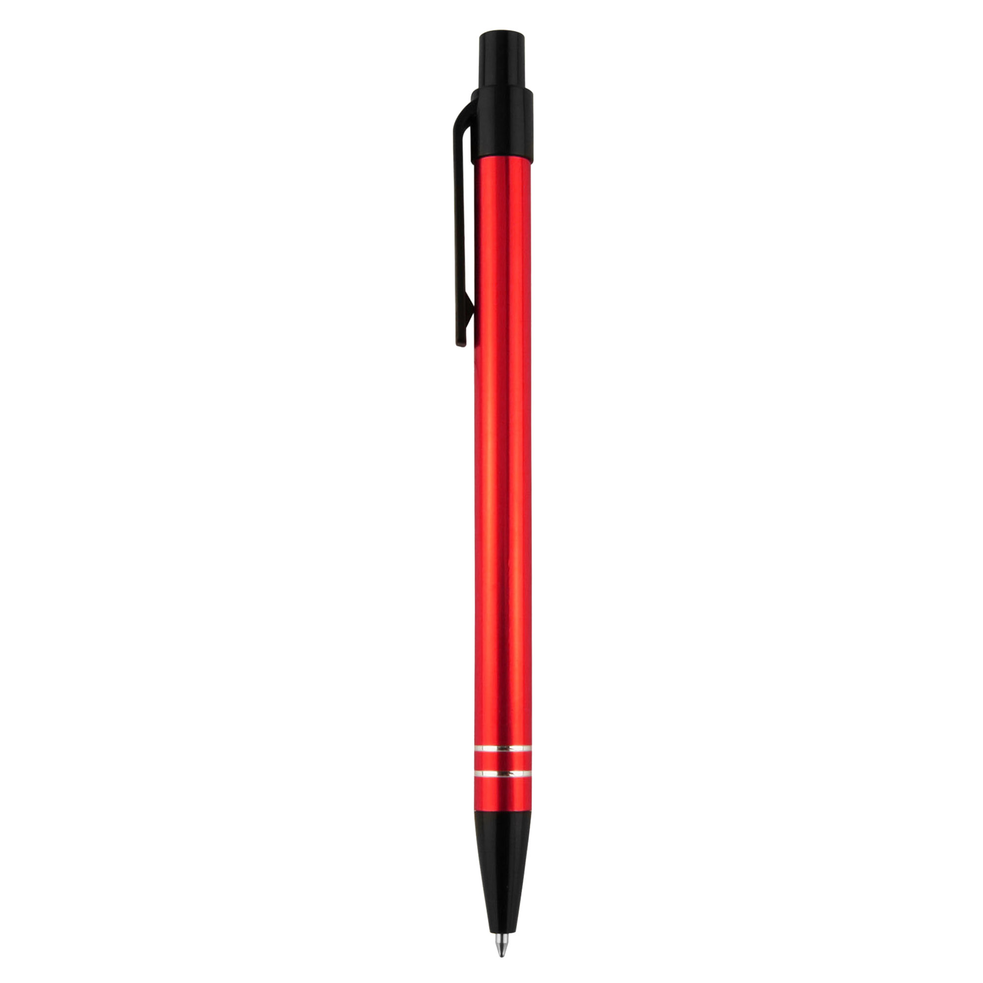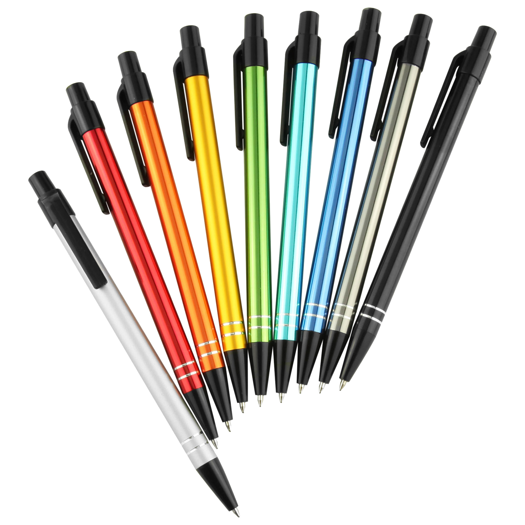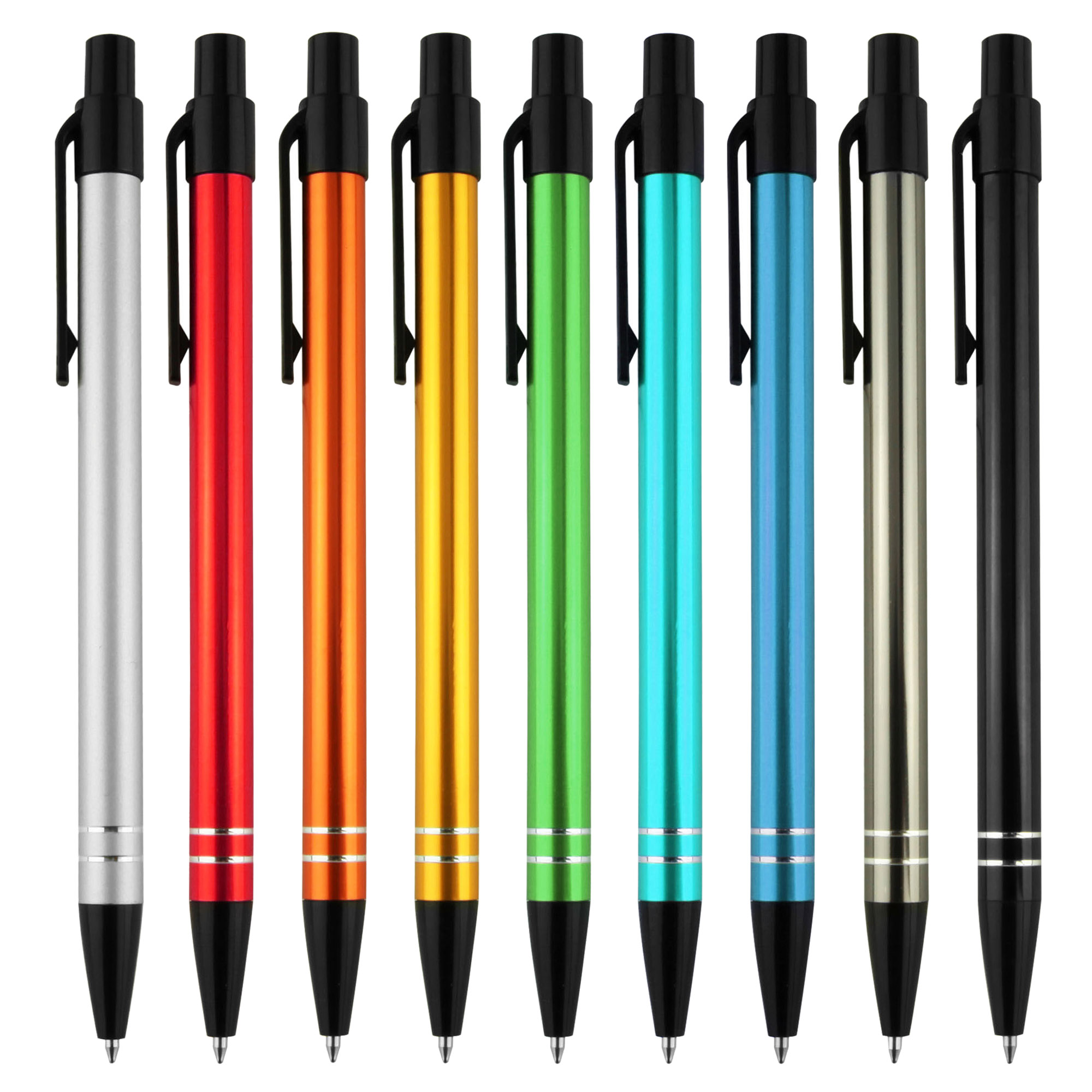Great colour range for matching to corporate or team colour, a slim profile barrel with easy retractable mechanism and 2 shiny silver rings at end of barrel. A simple stylish design aluminum metal pen finished in shiny rich metallic colours with contrasting black plastic trims. Plastic cross-type German manufactured black ink refill, 1200 meters writing distance, tungsten carbide ball provides you with quality writing. These writing tools are sure to get some attention.