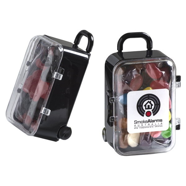Acrylic Carry-on Case filled with Jelly Beans 50g Colours Jelly Beans: Any mix of Black, White, Blue, Green, Red, Yellow, Orange, Purple and Pink. Flavour Jelly Beans: Black - Blackcurrent, White - Tutti Frutti, Blue - Blueberry, Red - Strawberry, Green - Apple, Yellow - Pineapple, Orange - Orange, Purple - Grape & Pink - Watermelon. Note: Ingredient Info: On each item (Sticker)