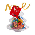 Acrylic Tree filled with a 50g bag of M&Ms. Gold Ribbon tied to Tree Note: Ingredient Info: On each item (Tag)