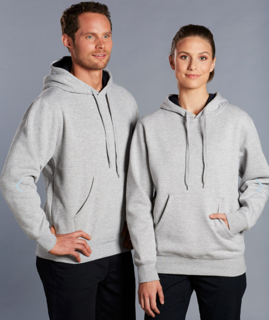 Close Front Fleece Hoodie Fabric: Fleece, 320gsm - 35% Cotton, 65% Polyester. Description: Contrast colour inside hood lining and draw strings. Raglan sleeve style. Close front. Two handwarmer pockets. A top design for work & outdoor activities.