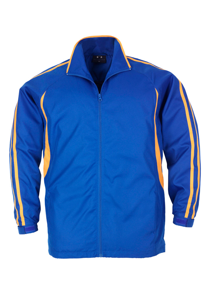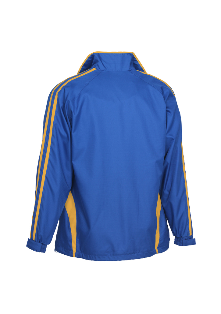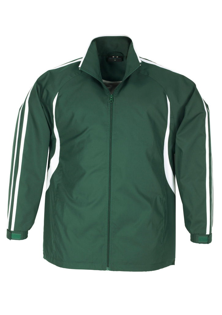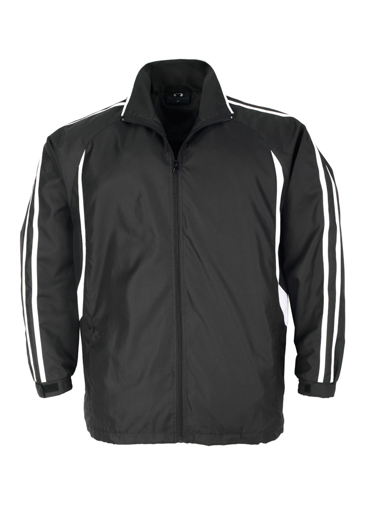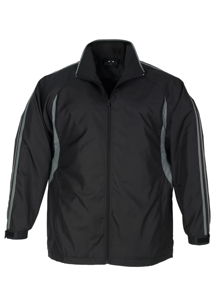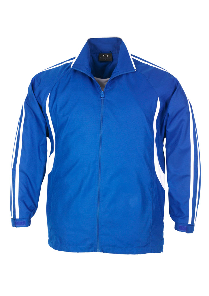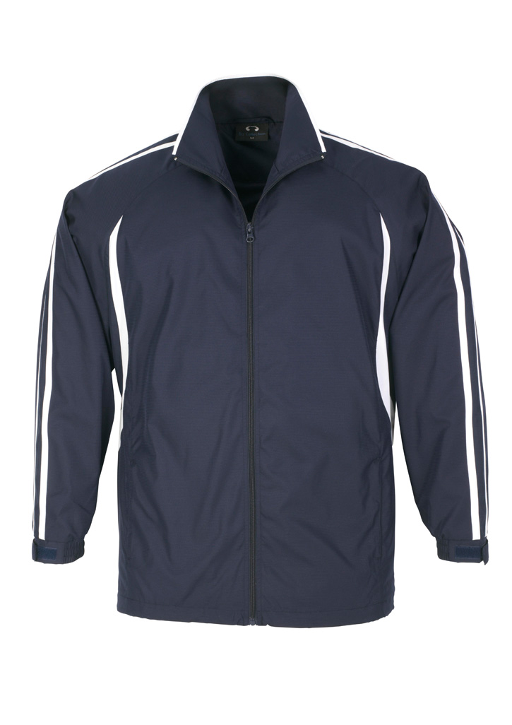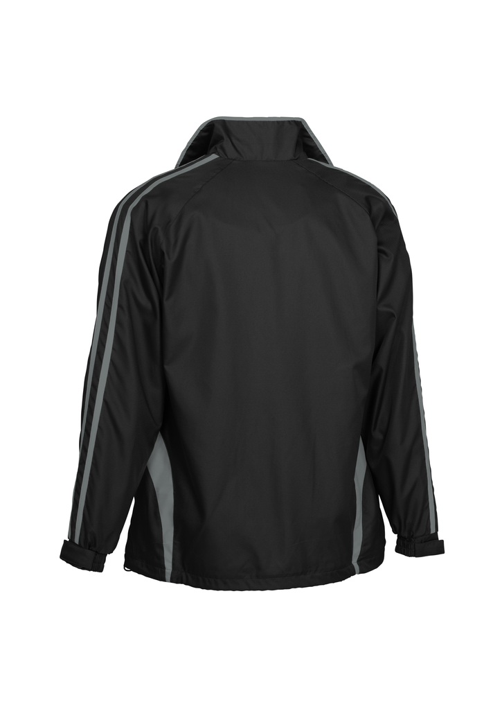 Outer: 100% Micro Fibre Jacquard Ripstop with Micro Fibre panels Body inner: Single jersey lining Sleeve inner: 100% Polyester Taffeta lining Raglan sleeve top with flash splice and twin stripe detail, full zip front with two zippered pockets, zipper access for embroidery, elasticated sleeve cuffs with adjustable flap.