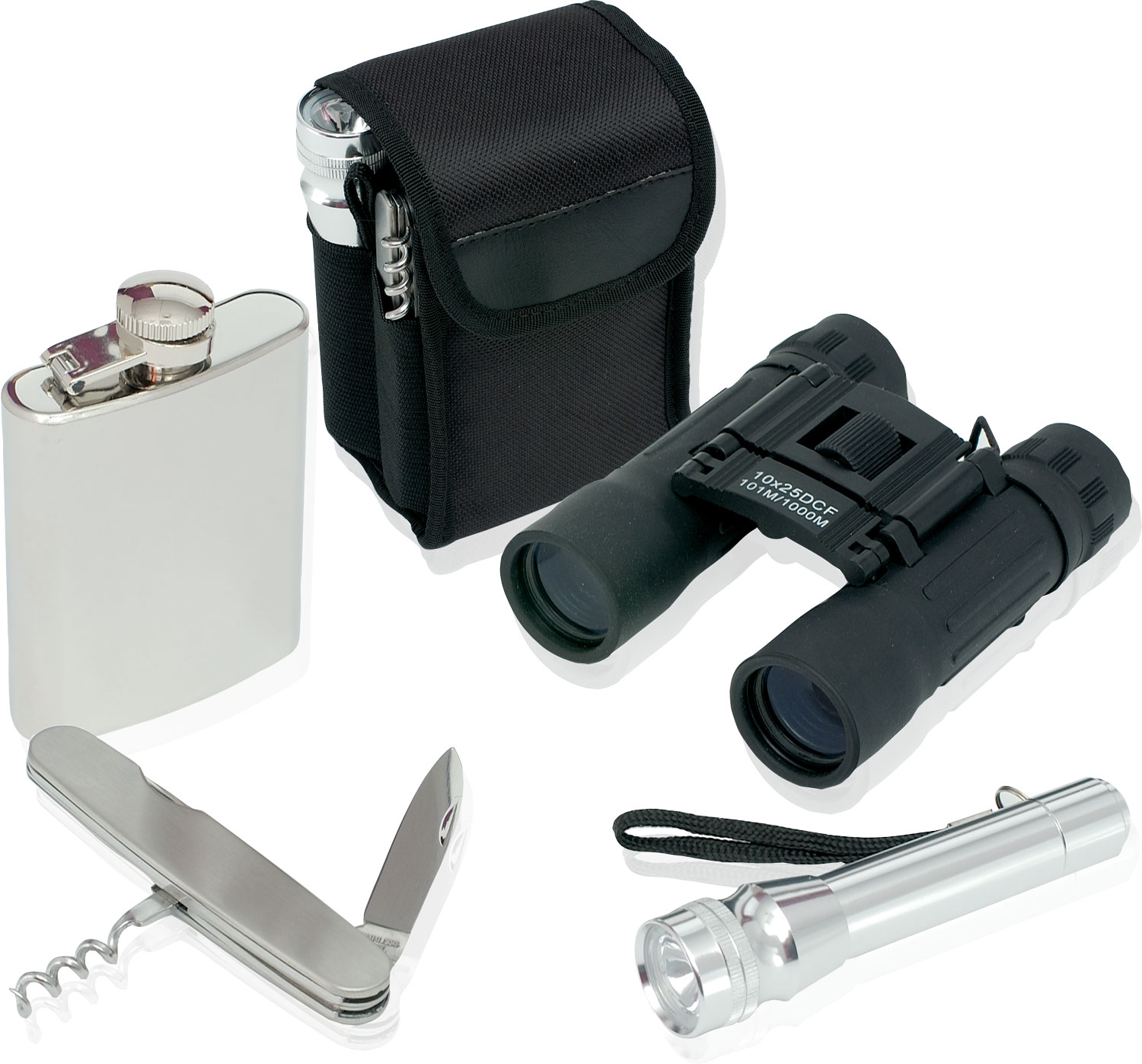 For the outdoor adventurer, waist belt carry case with binoculars, hip flask, torch and pen knife