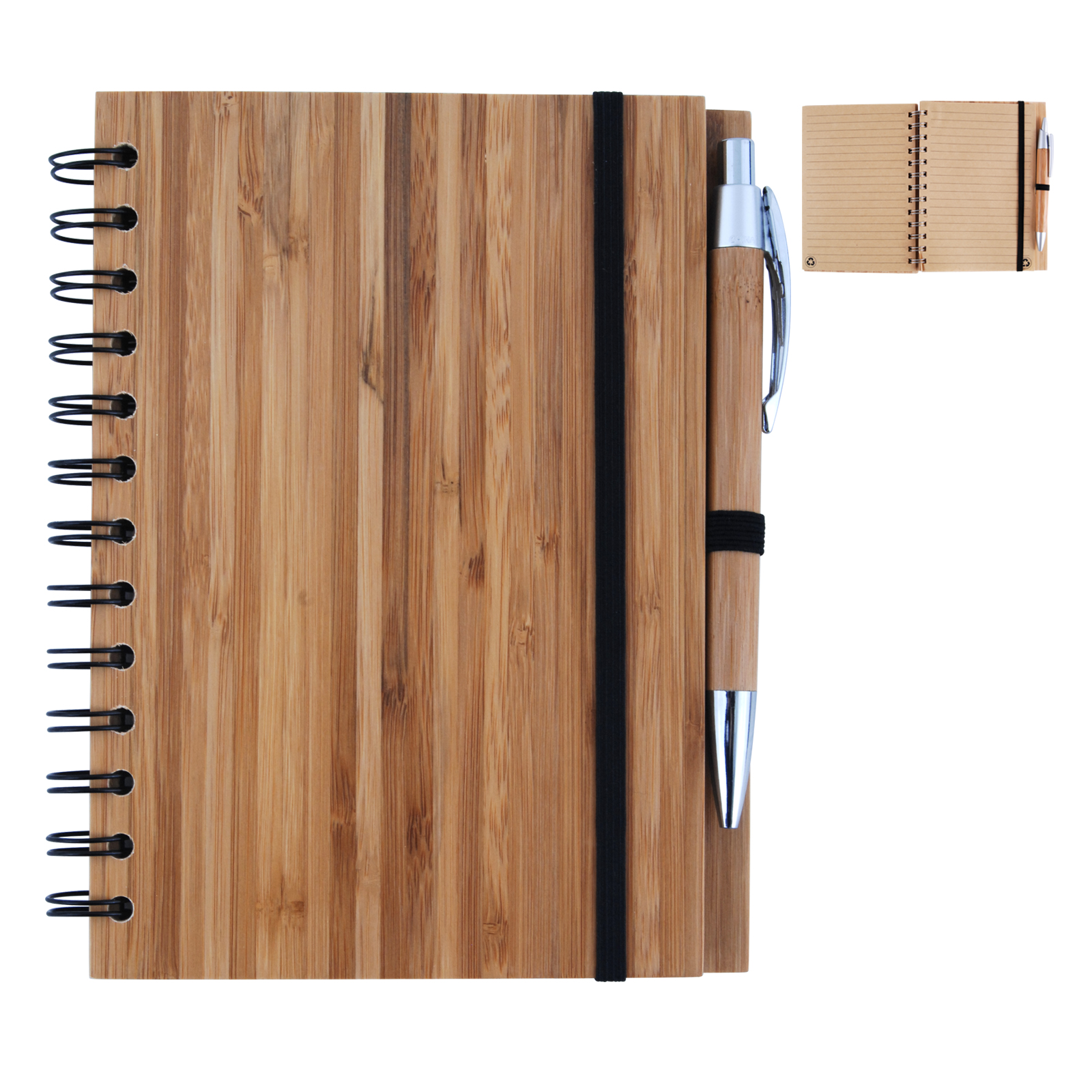 Eco friendly bamboo cover notebook with 70 sheets of spiral bound recycled lined paper, with bamboo/silver push button ballpoint pen. Elastic closure. Made from Bamboo, one of the worlds fastest growing plants. Recycled symbol printed on each page. Natural wood grain finish ensures no two items are ever the same!