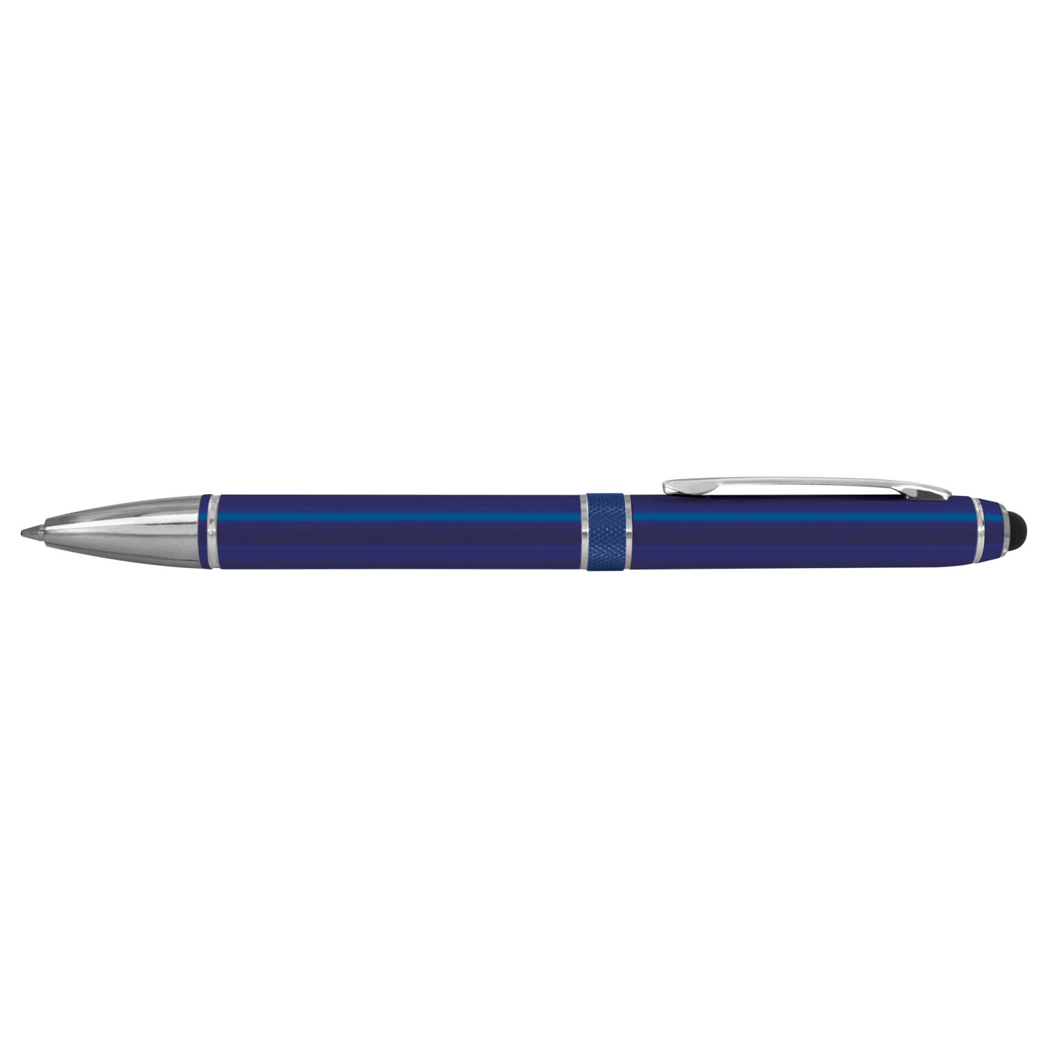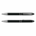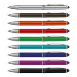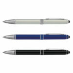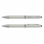 Twist action aluminium ball pen with a shiny anodised barrel, shiny Chrome accents and a stylus for use with touch screens. It has a Black ink refill with 1200 metres of ink and the barrel laser engraves to an oxidised White colour. . Decoration options: Pad Print | Screen Print | Laser Engraving