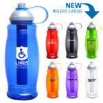 A 946ml plastic BPA free water bottle with an attached screw on lid featuring an easy pull leak resistant spout. Includes a free freezer bar.