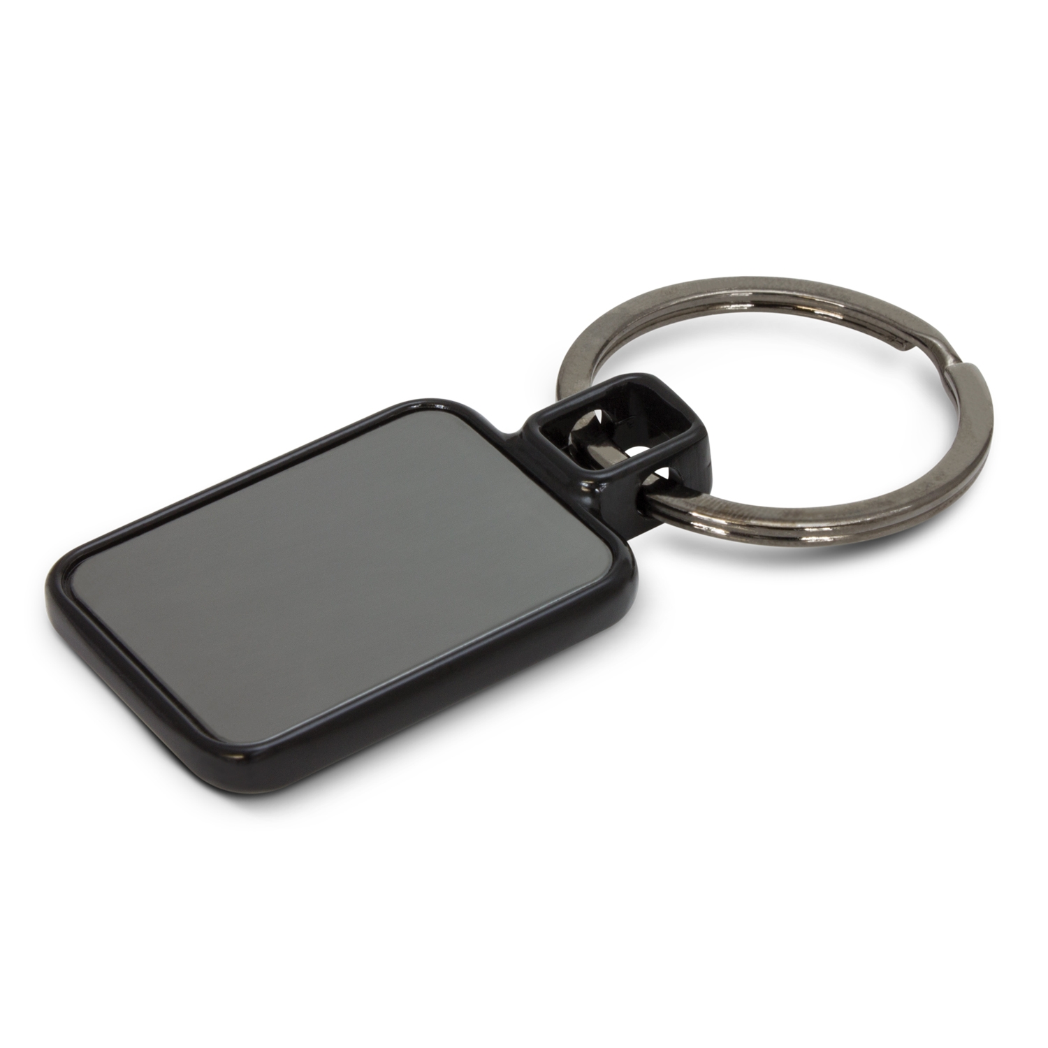 Metal rectangular key ring with a gunmetal plated finish on both sides which can be laser engraved to a natural etch. It is beautifully presented in a black gift box.