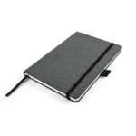 A5 hardcover notebook made from recycled leather over cardboard. Black ribbon page marker with black elastic retaining strap. Black elastic pen loop. 80 lined leaves, 160 pages (70gsm).