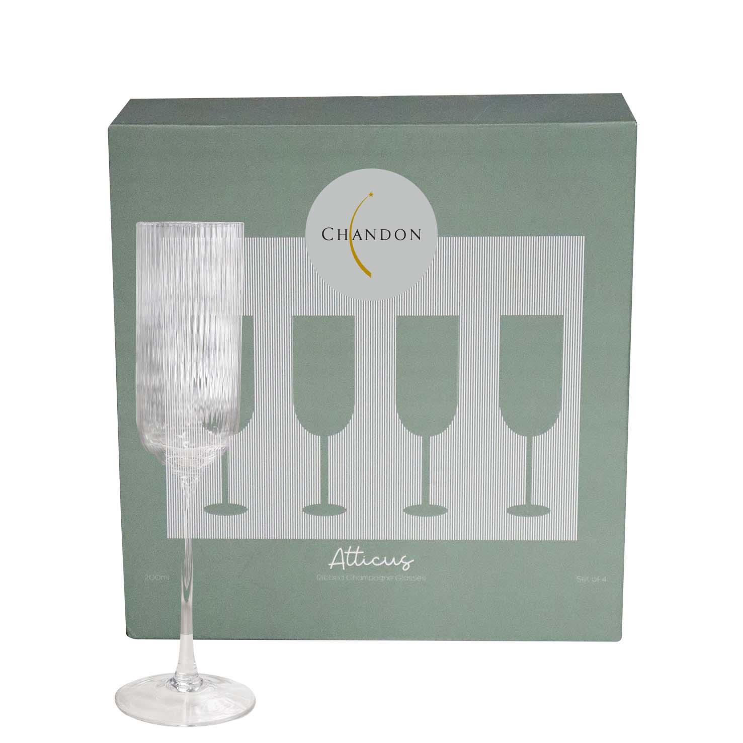 Lend an air of vintage sophistication to your next champagne toast with the Atticus Ribbed Champagne Glasses. Made from fluted glass, these highball glasses are sure to elevate your table and be the envy of all your dinner guests. As these glasses are hand blown, please allow for minor imperfections and differences between glasses. The Atticus Ribbed Champagne Glasses come in a set of 4 and are a perfect option for corporate gifting and hampers. Keywords: Glass, cocktail, alcohol, wine, champagne, beer