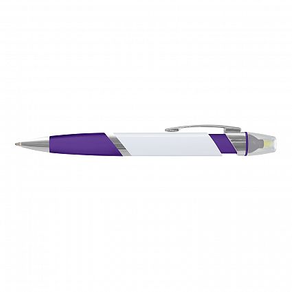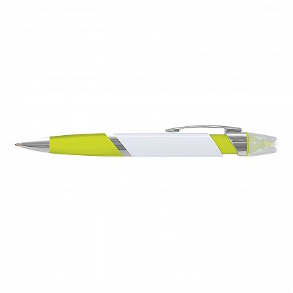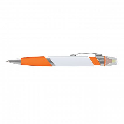 Retractable plastic and metal ball pen with a built in yellow highlighter. It has a frosted translucent soft touch grip, a clear highlighter cover and shiny chrome trim. Avenger can be branded in stunning full colour on both sides of the barrel. It has a black TRENDS refill with 600 metres of German manufactured DOKUMENTAL ink and a tungsten carbide ball for improved writing quality.