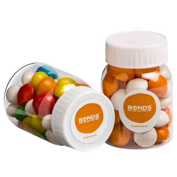 Baby Jar filled with 50g Chewy Fruits (Mixed or Corp Colours) Colours Chewy Fruit: Any mix of White, Blue, Green, Red, Yellow & Orange Flavours: White - Raspberry, Blue - Passionfruit, Green - Apple, Red - Strawberry, Yellow - Pineapple & Orange - Orange Colours of Lid: White, Blue & Red Note: Ingredient Info: On each item (Sticker)