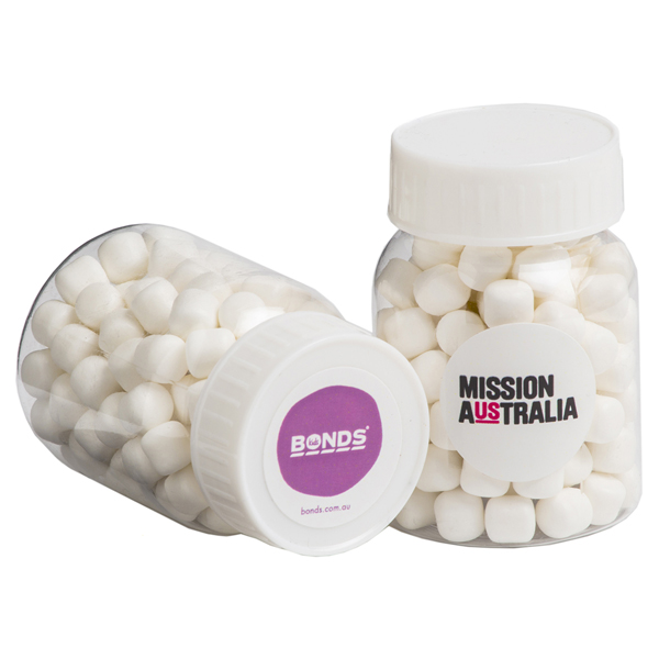Baby Jar filled with 50g Mints or Chewy Mints Colours of Lid: White, Blue & Red Note: Ingredient Info: On each item (Sticker)