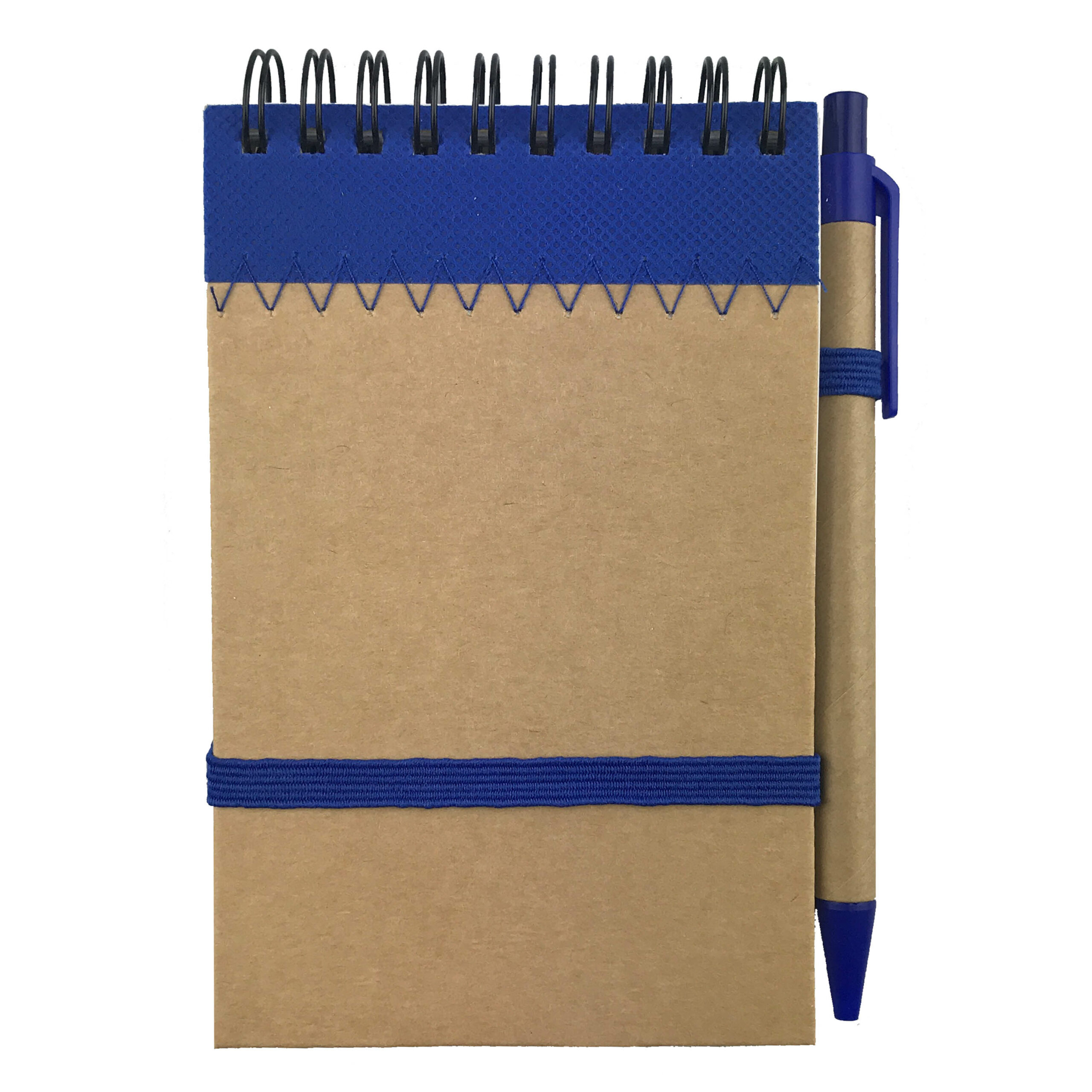 Recycled paper cardboard cover with top spiral binding. 70 pages of lined paper, 70gsm recycled paper. Coloured stripe top made of recyclable non woven. with Coloured elastic closure and color matching paper ball pen