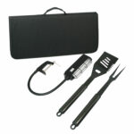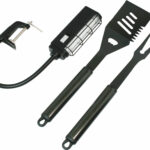 With a spatula and fork both of anodised steel and a practical bright fluorescent flexible light, this set is a must have for any barbeque. The 600D black Nylon case with carry handle is zipped for convenience.