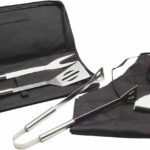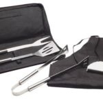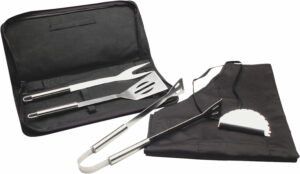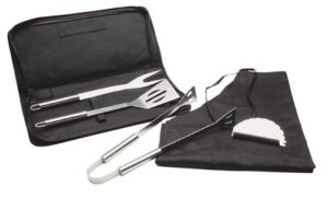 Ideal for camping, this set contains 4 quality stainless steel tools and a black cotton drill apron packed in a useful carry bag.