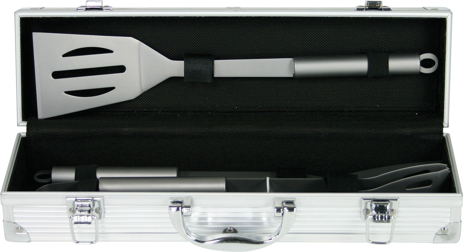 A lightweight Aluminium case containing three stainless steel BBQ tools, Fork, Spatula and Tongs with a satin finish.