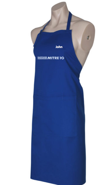 65% Polyester, 35% Cotton Twill, 190 GSM. Bib apron with adjustable halter self fabric strap around neck. Unique styling. Towel loop at back of apron. 1 Large central front pocket with special side slide pen and bottle opener provision.