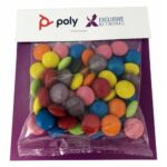 Billboard Card with 50g Choc Bean bag stapled to card 250gsm Paper Stock Full Colour/ Double side print (Mixed or Corporate Colours available) Colours Choc Beans: Select any combination of White, Black, Blue, Green, Red, Purple, Yellow, & Pink Best Before: 12 months
