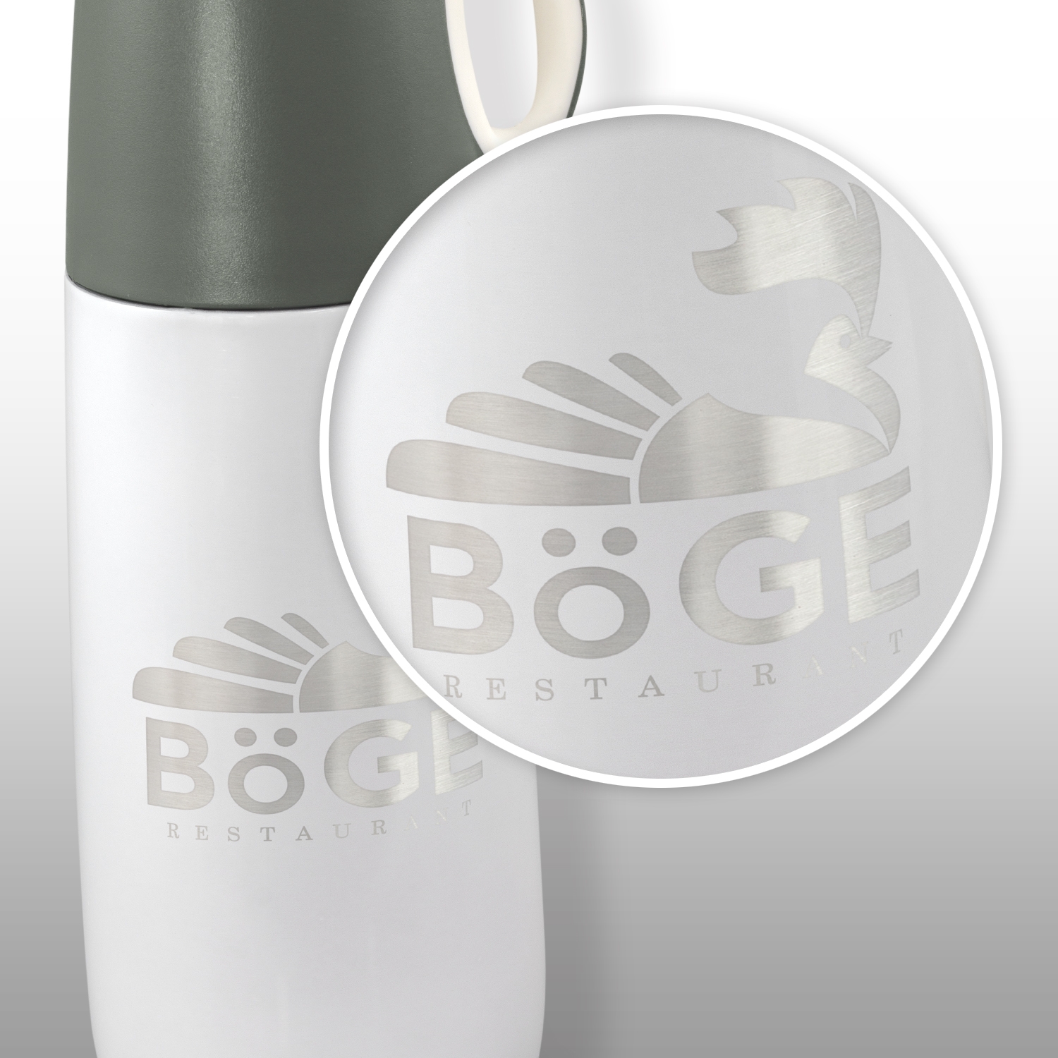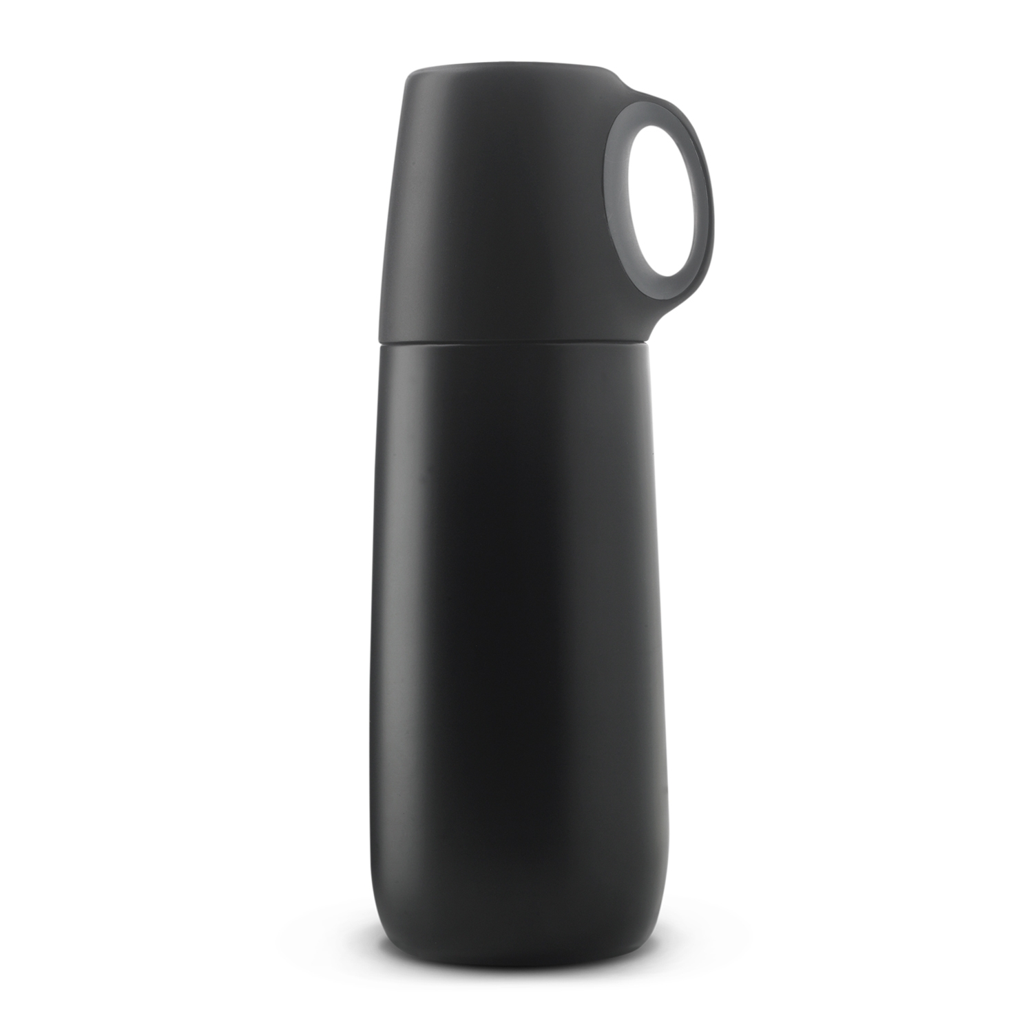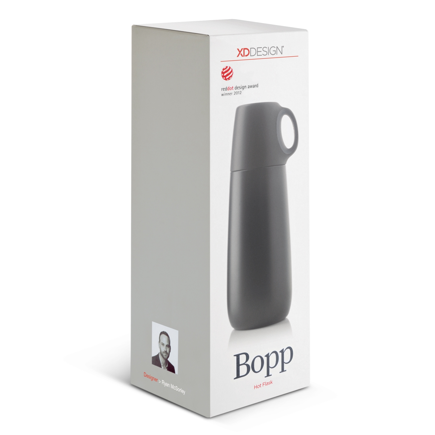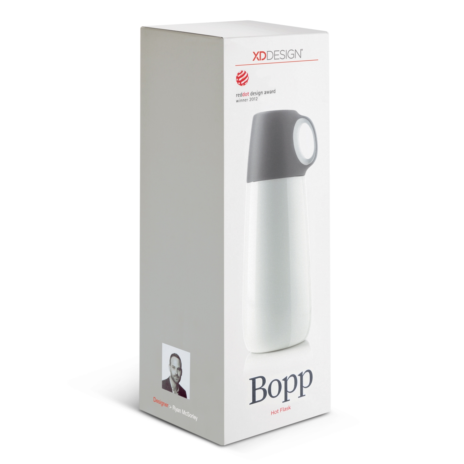 Award winning 600ml, double wall stainless steel vacuum flask with a trendy matt finish which is presented in an XD Design gift box. It features convenient push button operation along with a smart two tone cup which has a soft touch handle. . Decoration options: Pad Print