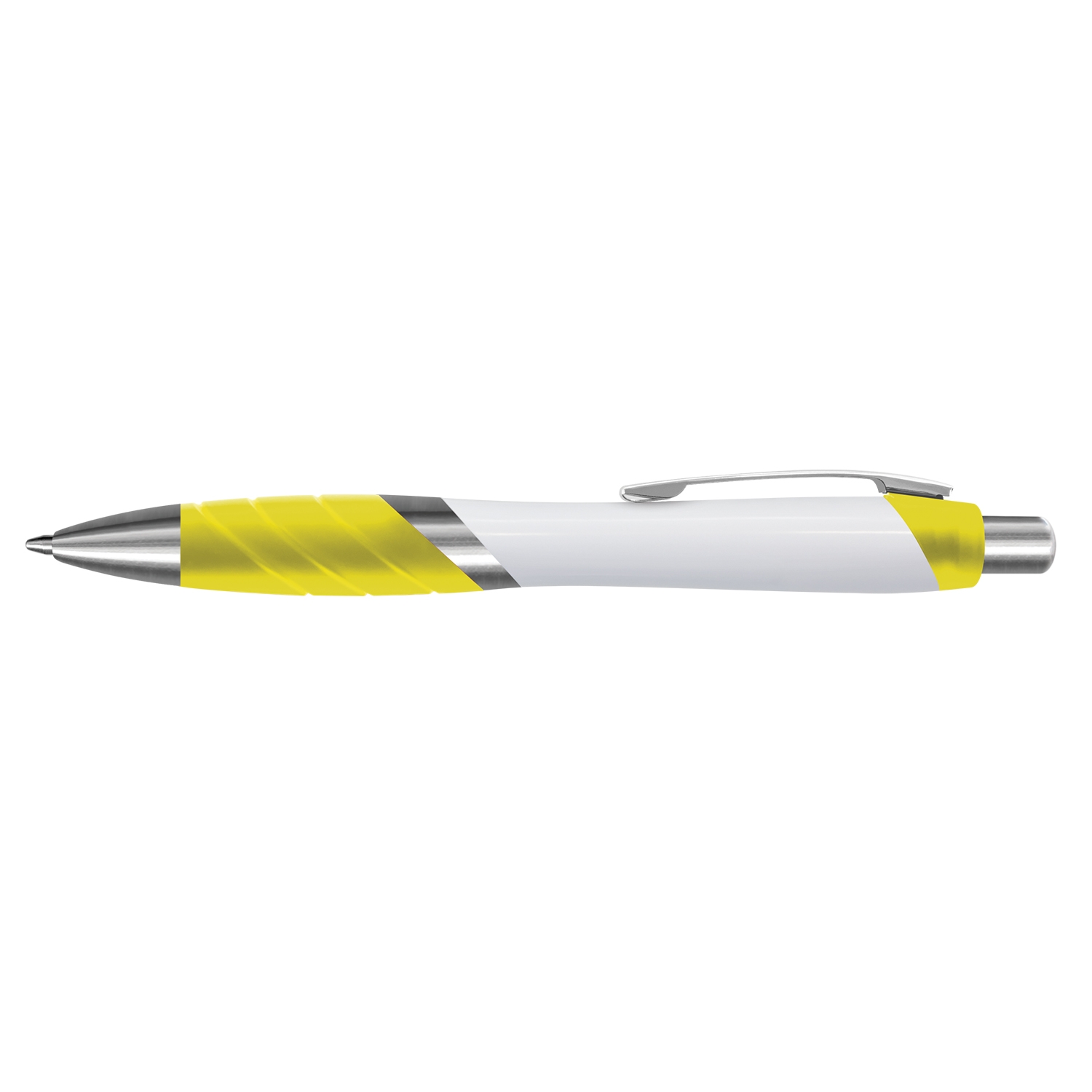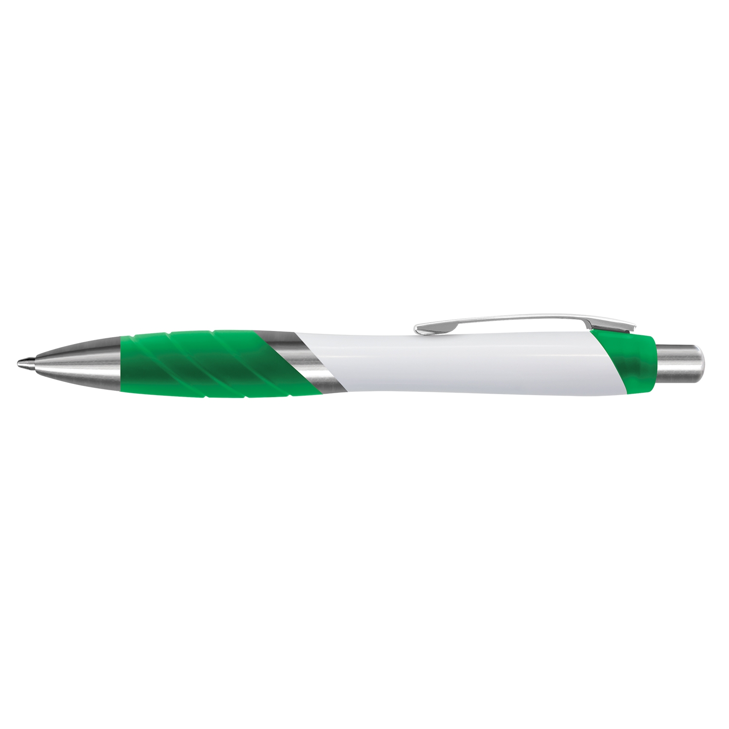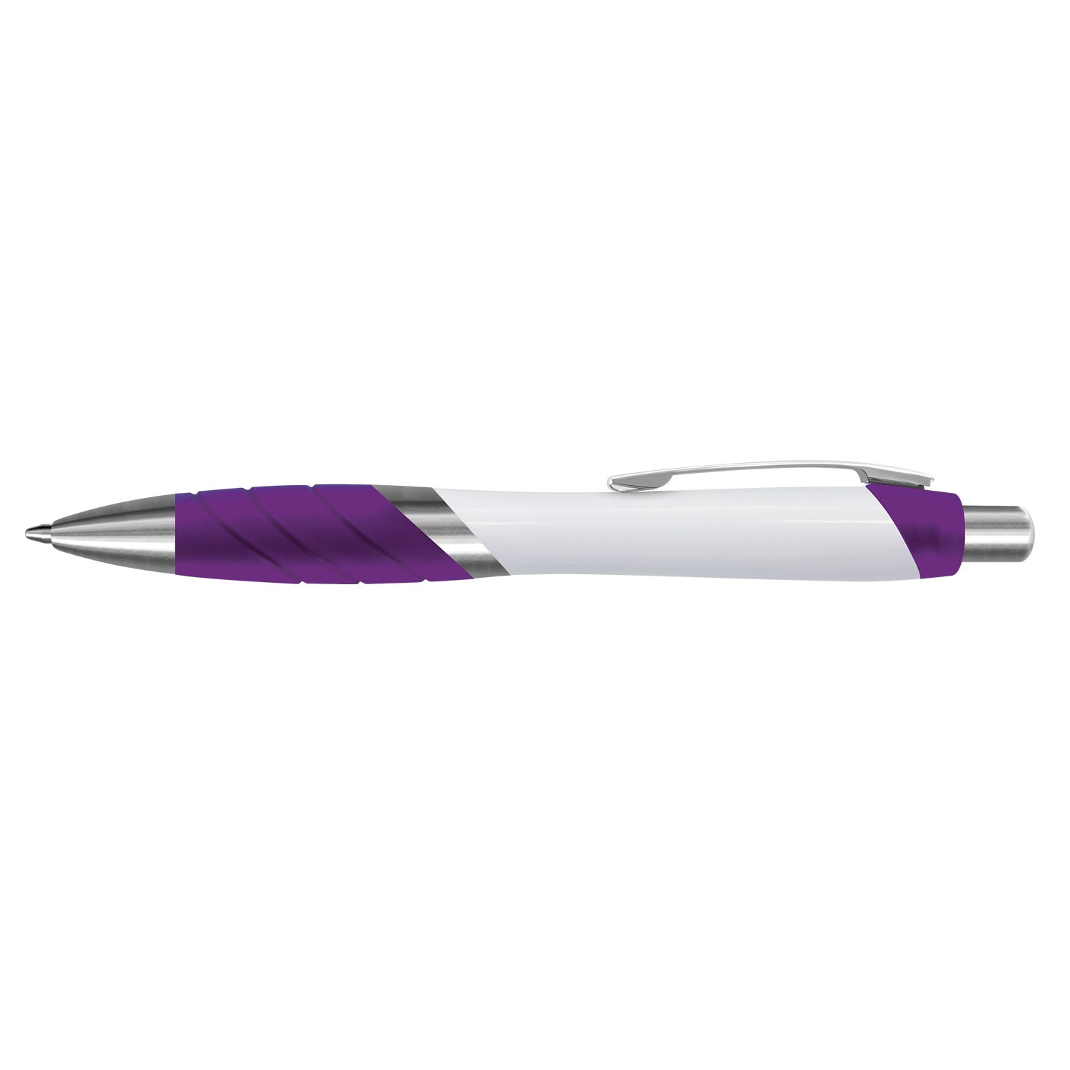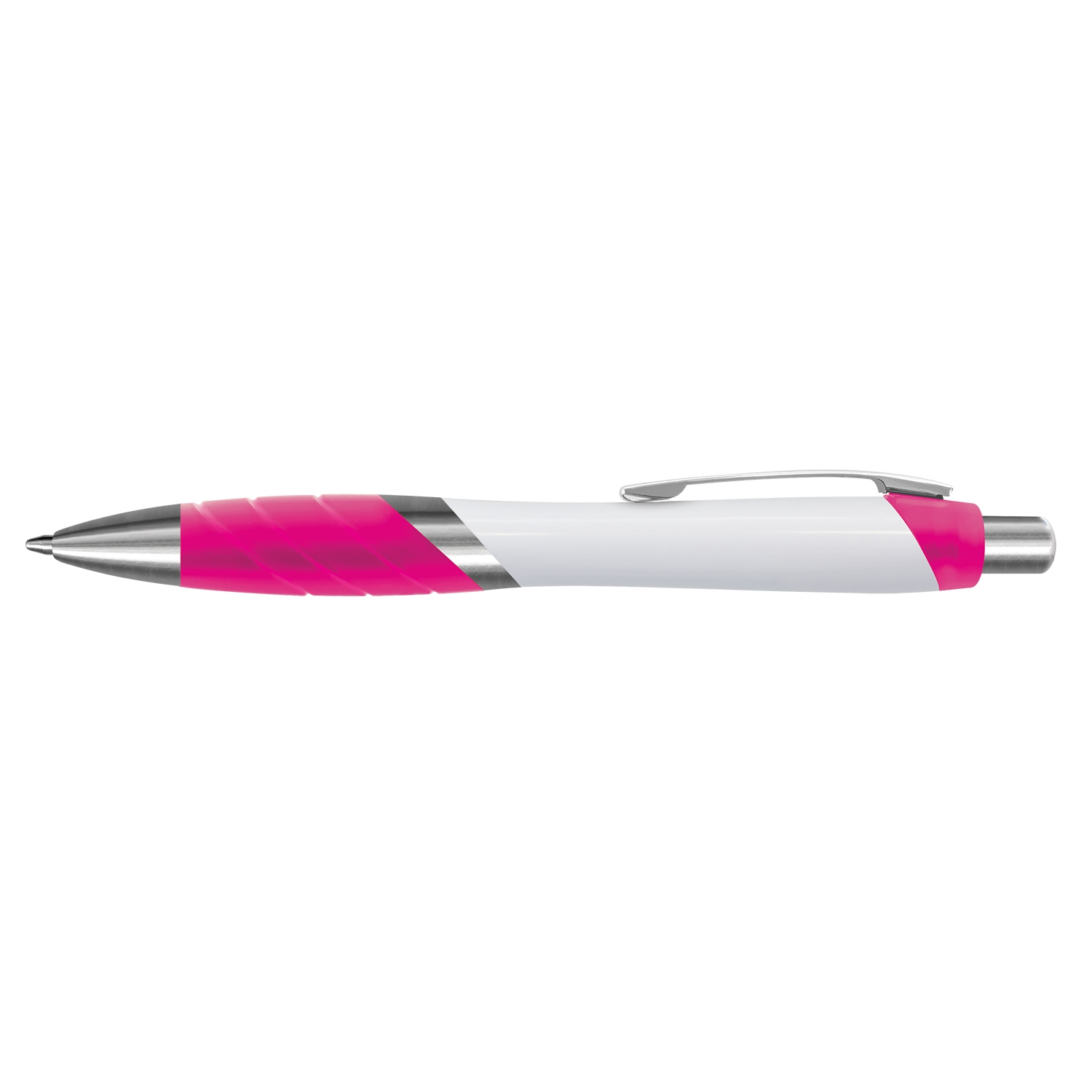 Retractable plastic and metal ball pen with a white barrel, a translucent soft touch rubber lacquered grip and top and shiny chrome accents. It has a Black ink large volume refill with 1800 metres of German manufactured DOKUMENTAL ink and a tungsten carbide ball for improved writing quality. Blue ink is available for an additional charge. . Decoration options: Pad Print | Direct Digital