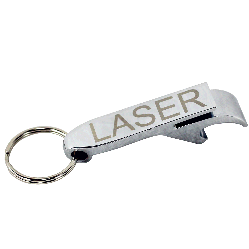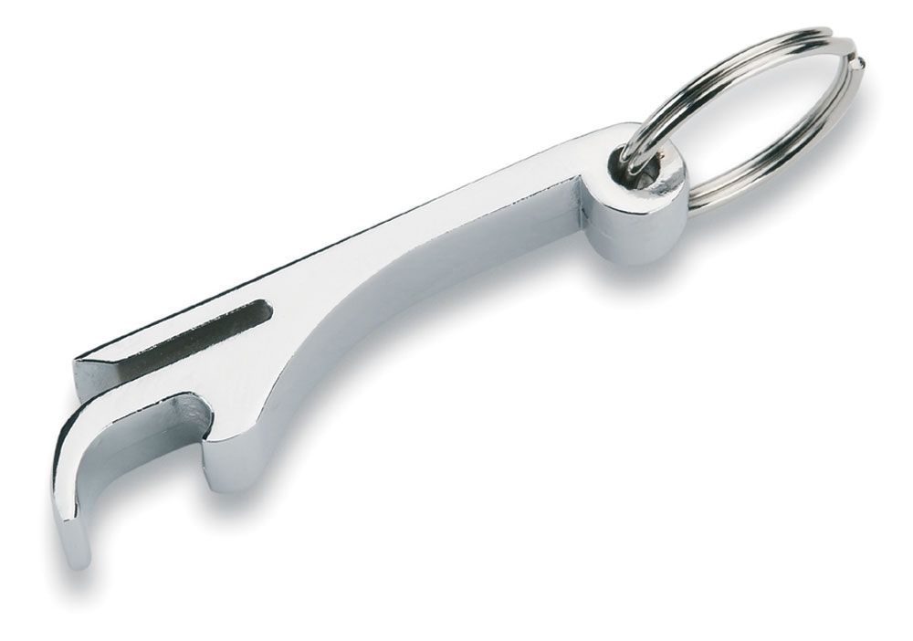 Handy bottle opener fits perfectly onto your keyring. Made from metal/nickel silver finish. Dual function with bottle and can opening features