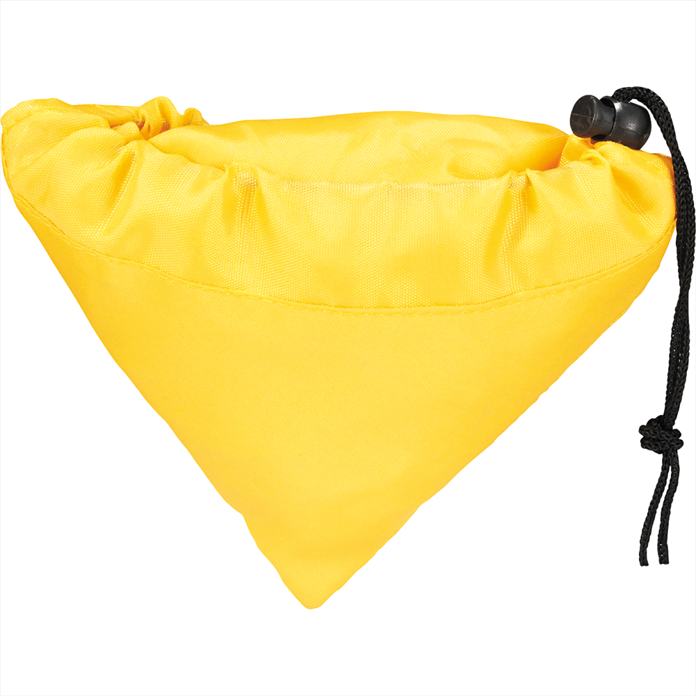 Shopper tote has an open main compartment with double handles and a unique fold-away function that gathers into a corner with drawstring closure. Main compartment capacity is approximately 5 litres.
