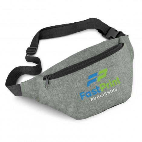 Versatile travel bag which is ideal for holding passports and important items while travelling or at events. It is manufactured from 300D polyester with an on-trend heather style finish and a black zippered closure. Byron has a zippered internal pocket and an adjustable woven waist strap with a secure snap-lock closure.