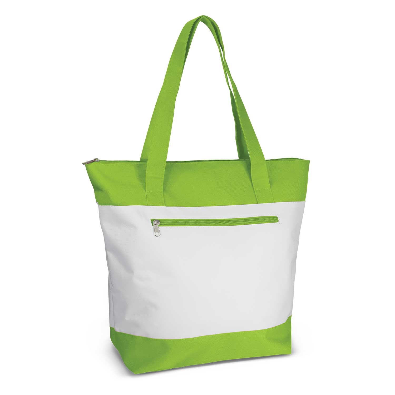 Smart two tone tote bag with a rounded gusset and sewn in base for added capacity. It is manufactured from tough 600D polyester and has a zippered front pocket, a secure zippered top closure and long woven carry handles so it can be comfortably carried on a shoulder.