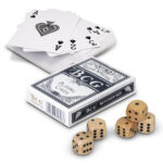 Provide hours of fun with this box of playing cards and dice. Card game set includes 52 Deck Pack of 300GSM Cards and five dice. Wood is a natural material which produces unavoidable variances in the grain pattern, colour and branding. It laser engraves to a natural etch.