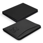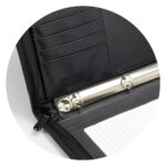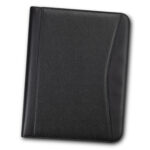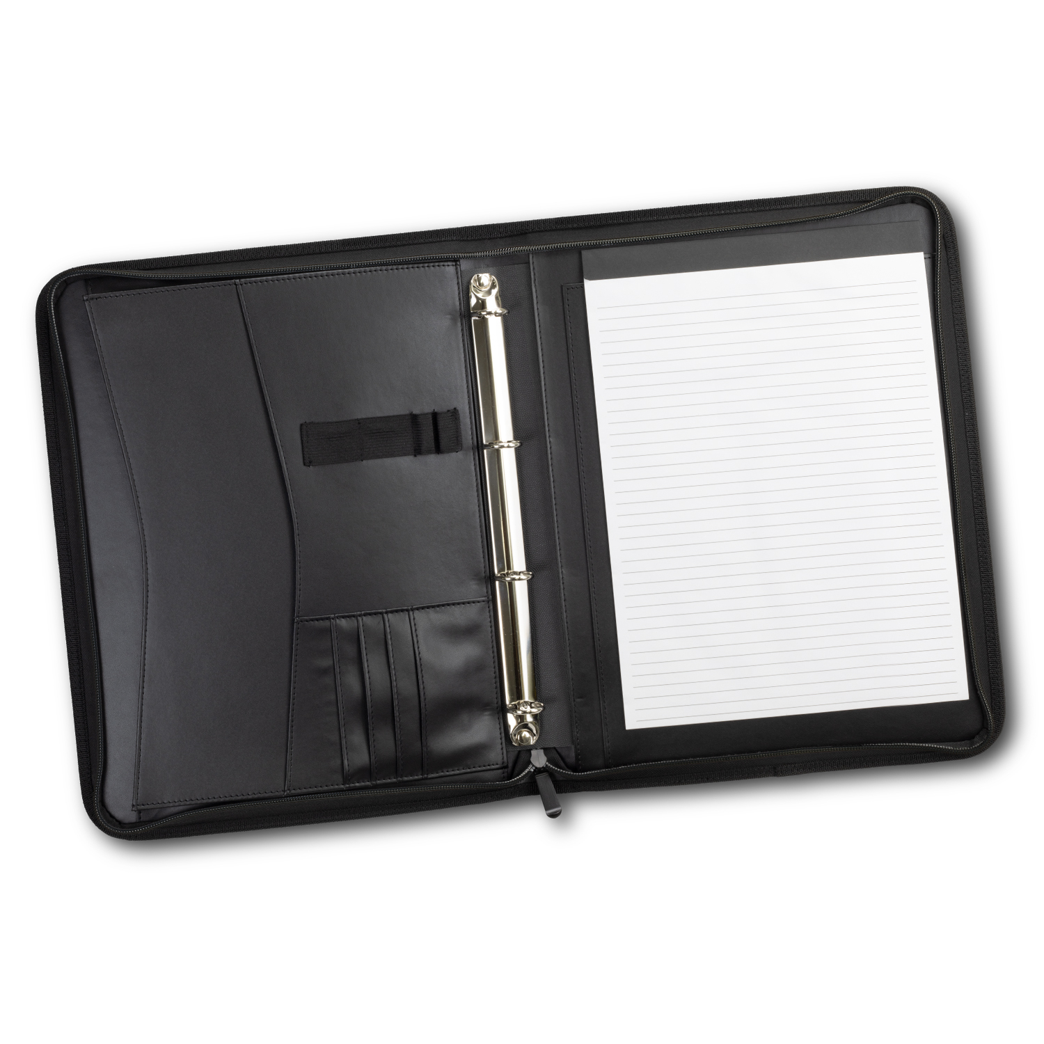 Professional portfolio manufactured from PU with removable metal ring binders. It features a zippered closure for added security and convenience. The portfolio also includes internal loops for pens and flash drives, as well as large document slips and three business card holders.