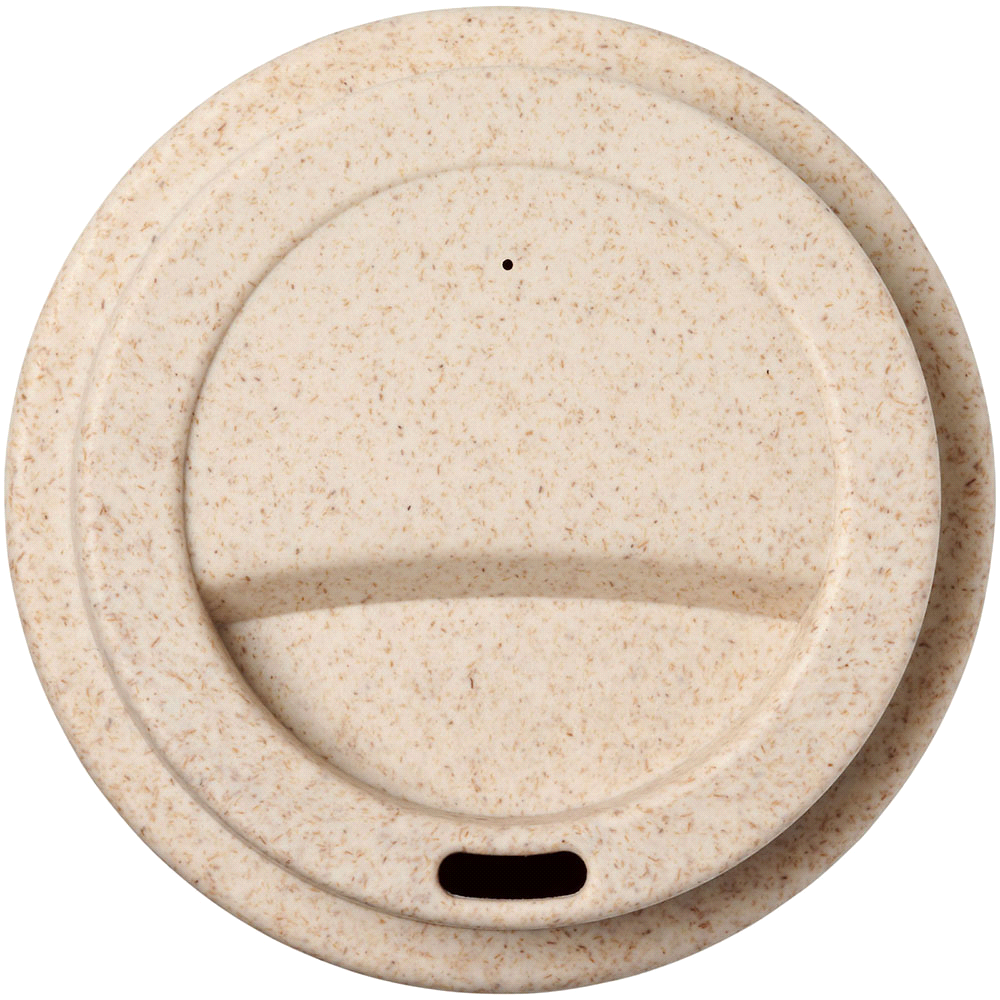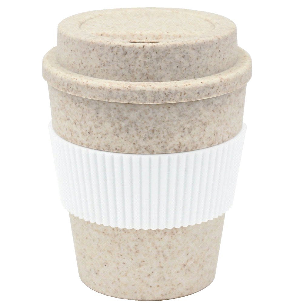 This practical design of a reusable coffee cup is 350ml and comes with a heat resistant ribbed silicone band with a flat section for decoration. Made from 50% bamboo and 50% polypropylene.