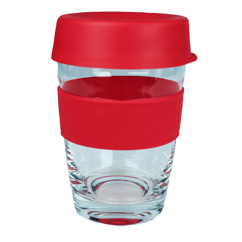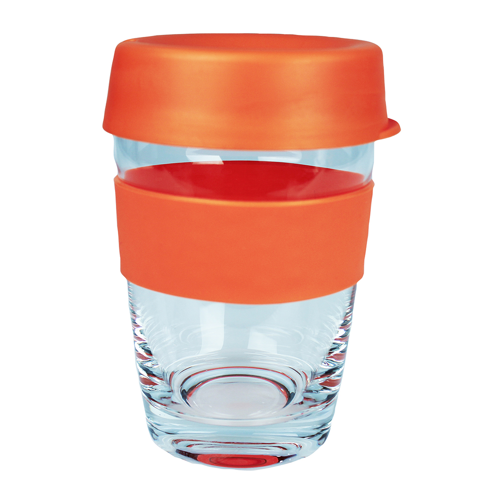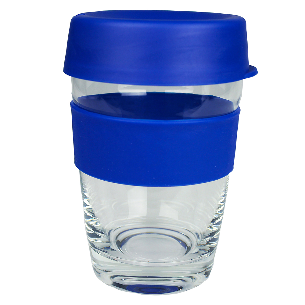 340ml glass coffee cup with push down PE lids and silicone bands available in a range of colours. Available in 6 colours or mix-and-match lids and sleeves in up to 36 combinations. The glass carry cup is supplied in a folded cardboard box for protection
