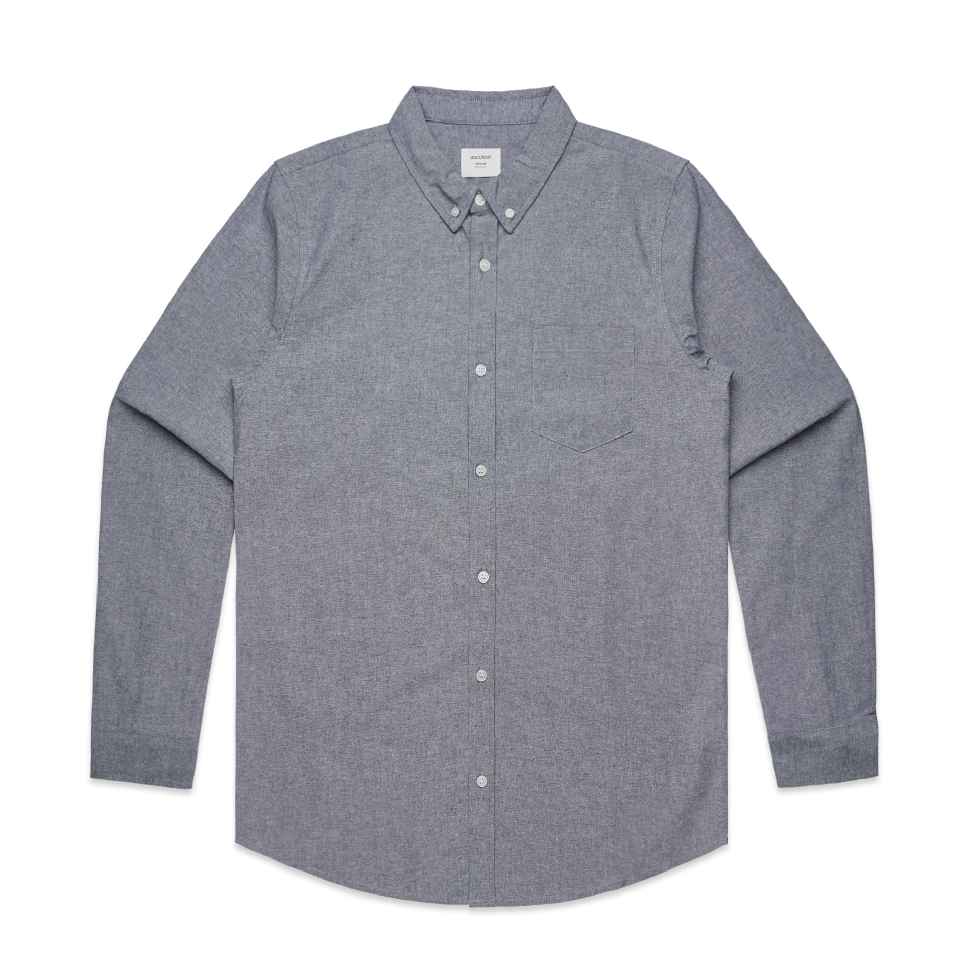 Men’s regular fit shirt. Light weight, 150 GSM 100% cotton. Chambray weave, button-down collar, chest pocket, clear buttons, back yoke with centre pleat, side seamed, preshrunk to minimise shrinkage.