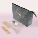 Chic cosmetic pack includes Montana RPET Felt Cosmetic Bag, Ritz Lip Balm, Bamboo Comb and Bamboo Emery Board.