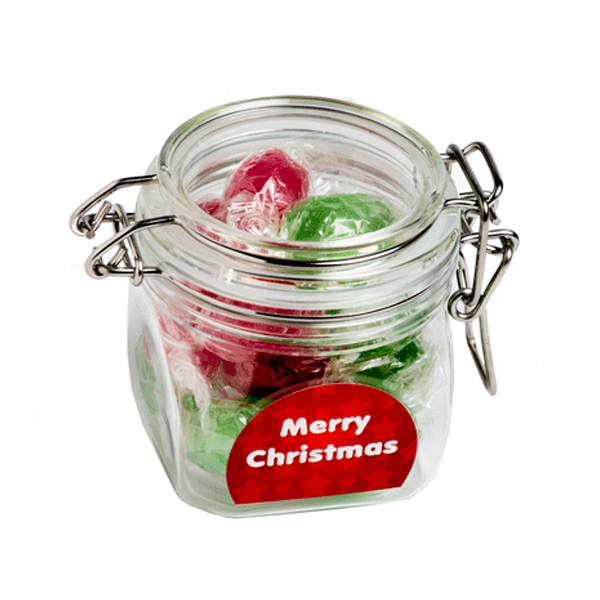 Acrylic Canister filled with 120g Christmas Twist Wrapped Boiled Lollies (approx. 15) Colours of Confectionary: Boiled Lollies: Any mix of: White, Blue, Green, Red, Yellow, Orange, Purple & Pink Note: Ingredient Info: On each item (Sticker)