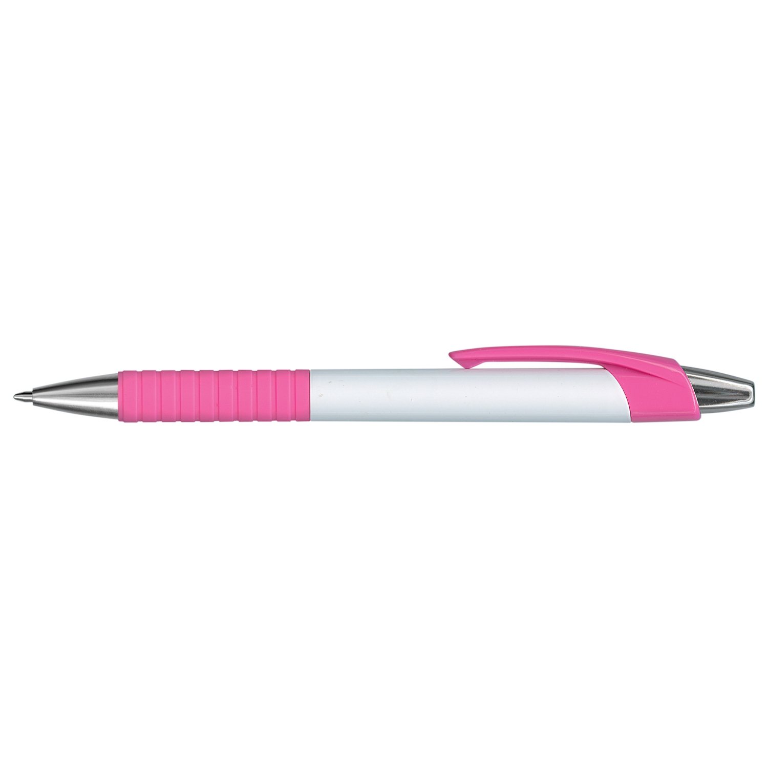 Retractable plastic and metal ball pen with a white barrel, a soft touch rubber lacquered grip and shiny Chrome accents. It has a black ink refill with 1200 metres of German manufactured DOKUMENTAL ink and a tungsten carbide ball for improved writing quality. Decoration options: Pad Print | Screen Print | Direct Digital