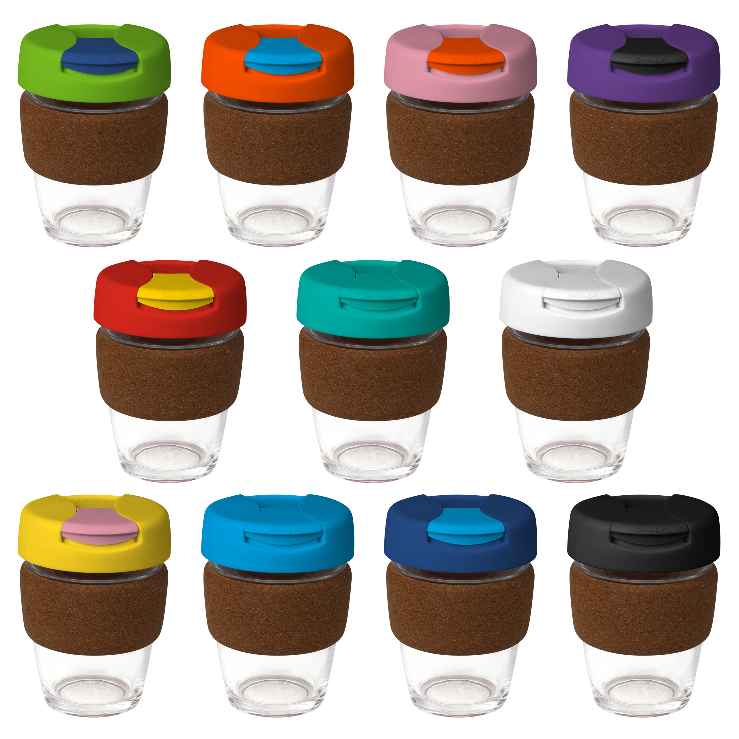 Coffee Cup / Mug 12oz/340ml Glass Karma Kup Cork Band Plastic Flip Lid Reusable Eco Friendly