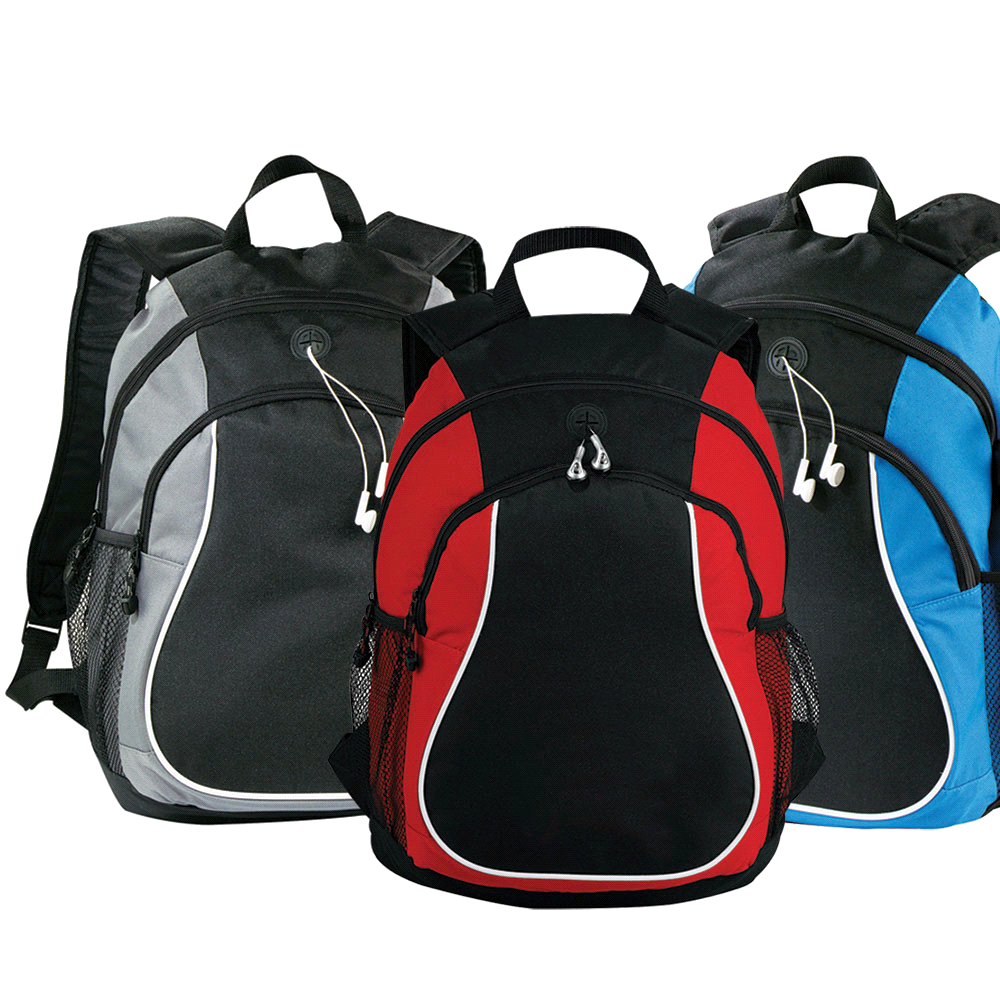 Made from 600D Polyester. Large zippered main compartment with headphone port. Side mesh water bottle pockets and padded back. Available in 2 colours