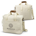 Spacious and stylish 26L cooler tote bag with PE foam insulation encased in a water-resistant PEVA inner liner. The outer construction is natural 100% 450gsm cotton canvas with stunning leather-look PU accents. It has cotton carry handles with a PU cuff and a removable, adjustable shoulder strap. Other features include a zippered top closure, piping details to hold the structure and a large slip pocket.
