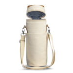 Stylish wine cooler bag that will hold one standard wine bottle. Colton features PE foam insulation encased in a water-resistant PEVA inner liner, and the outer construction is natural 100% 450gsm cotton canvas with stunning leather-look PU accents. It has a webbed cotton carry handle with a PU cuff and a removable, adjustable shoulder strap. Other features include a zippered top closure, piping details to hold the structure and a large slip pocket.