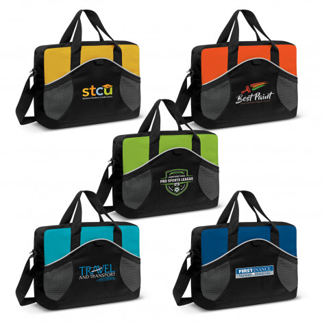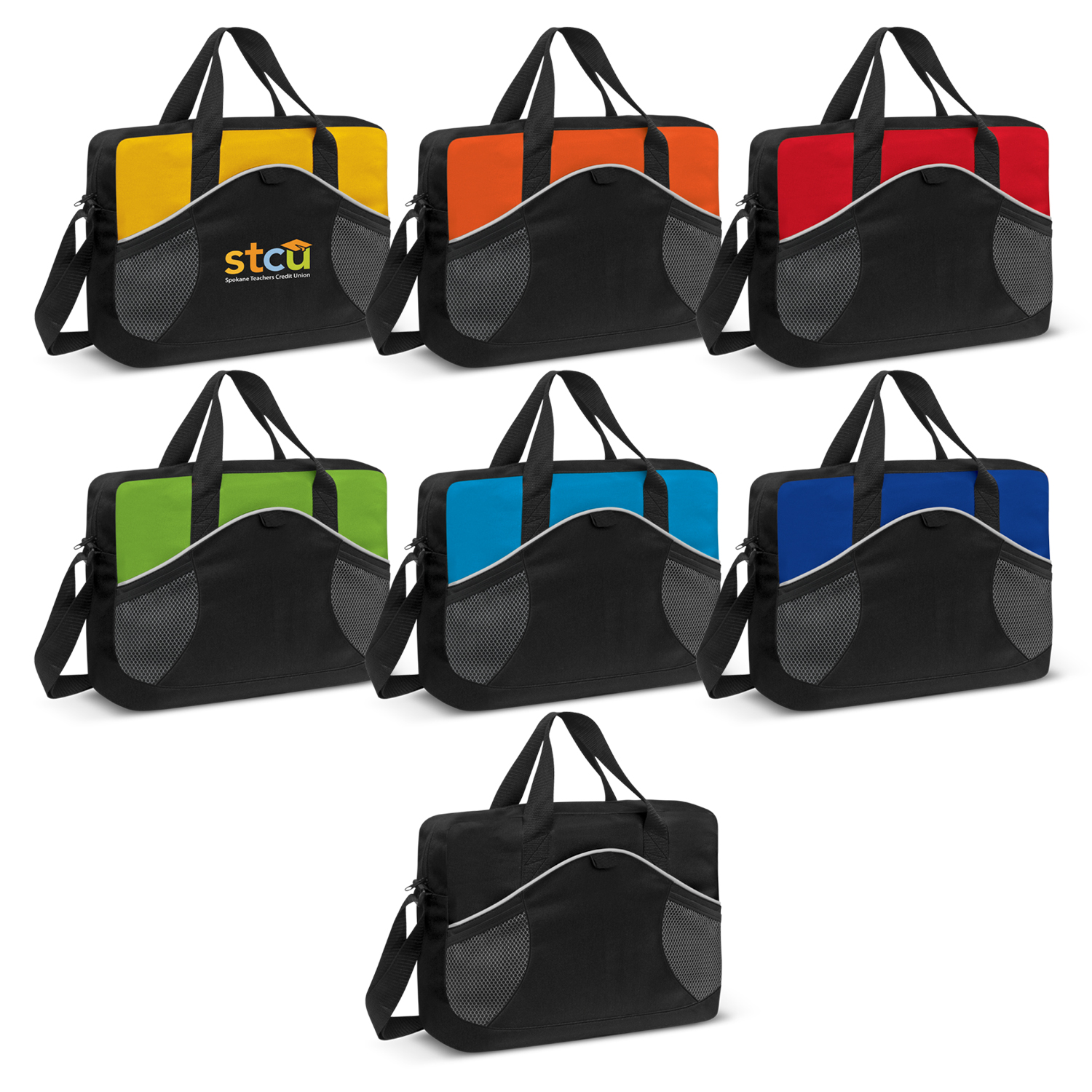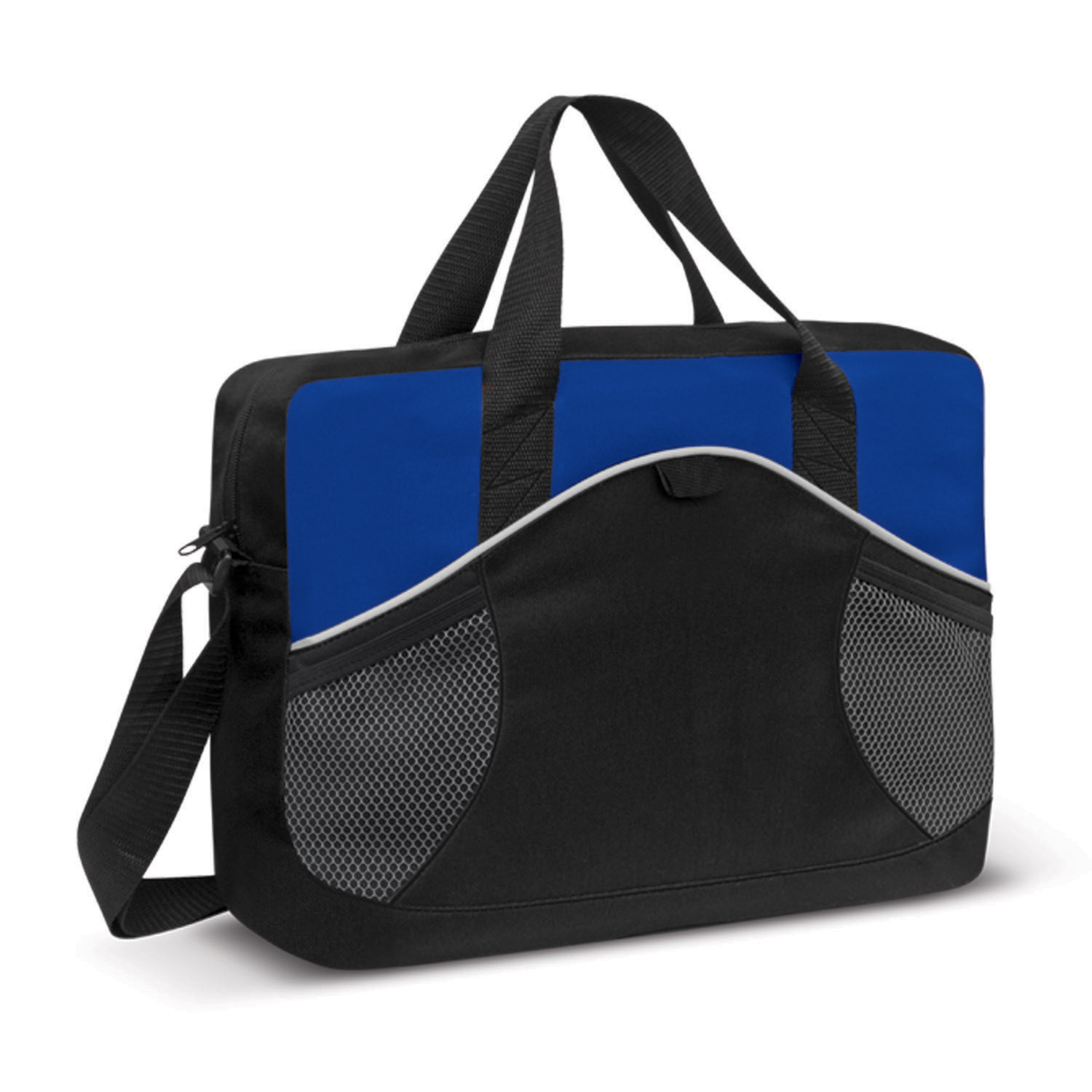 Stylish satchel manufactured from robust 600D polyester. Has both handles and an adjustable shoulder strap as well as a front external pocket, mesh side pocket and a business card holder on the back. . Decoration options: Screen Print | Embroidery | Digital Transfer