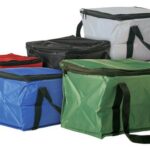 Classic style 12 can cooler bag, 70D nylon with thick foam insulation, PVC lining and two black carry handles.