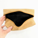 Durable quality cosmetic paper bag is made of German washable kraft paper that is lightweight with high tear resistance. Made of natural wooden fiber and synthetic latex. Comes with black polyester inner liner and natural coloured brown polyester zip closure and metal zip puller. The perfect compact cosmetic bag to take on the go.