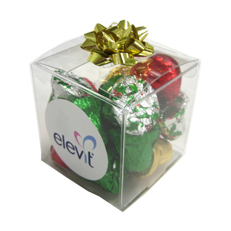 Cube filled with Christmas Chocolates 60g. Gold Bow AdheredChristmas Star & Bell Chocolates x8 (Sticker)