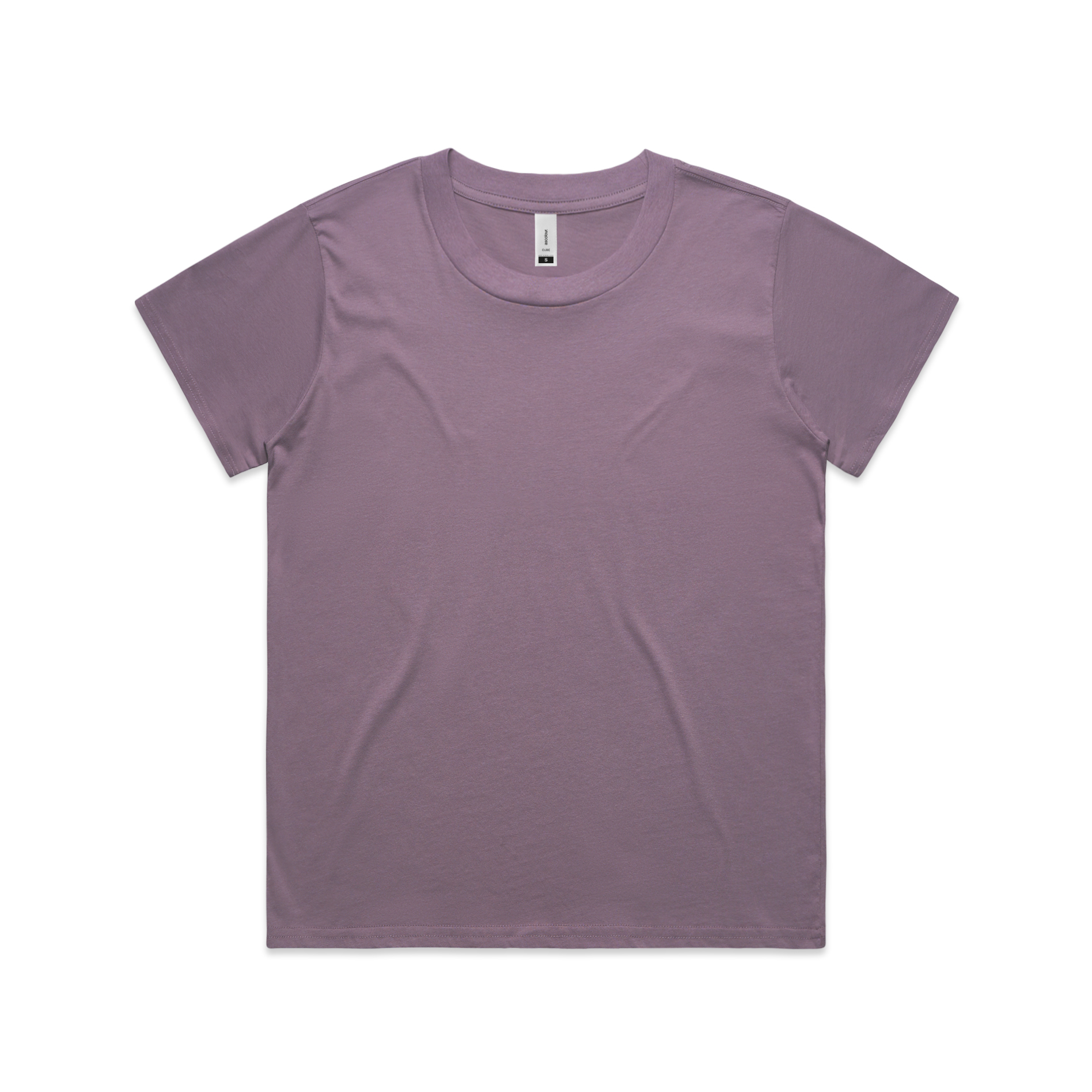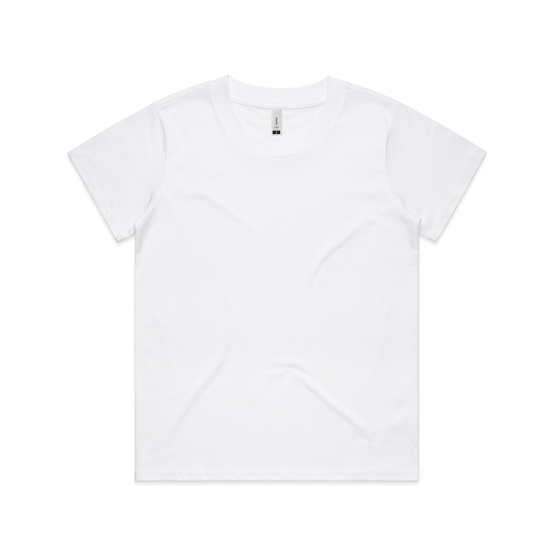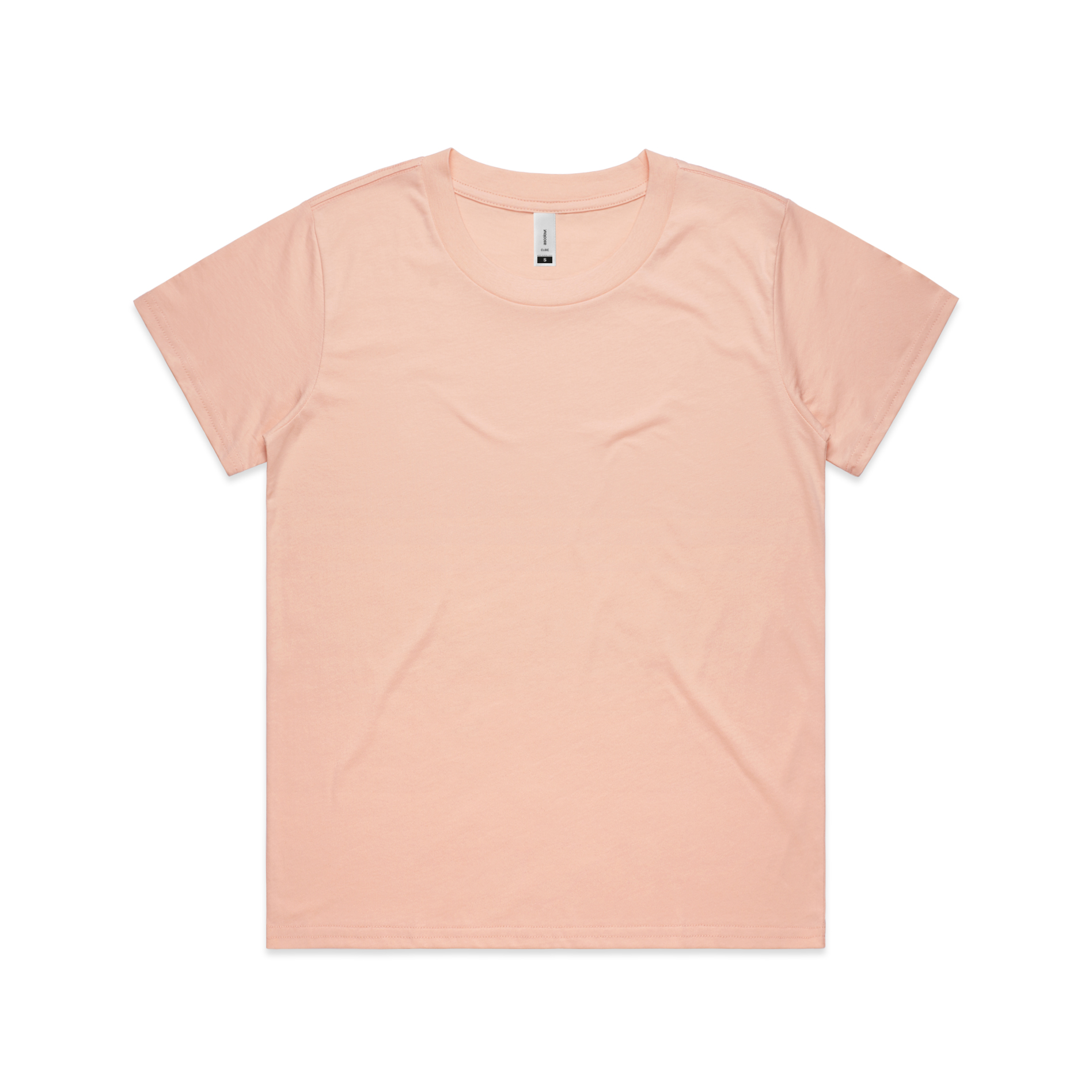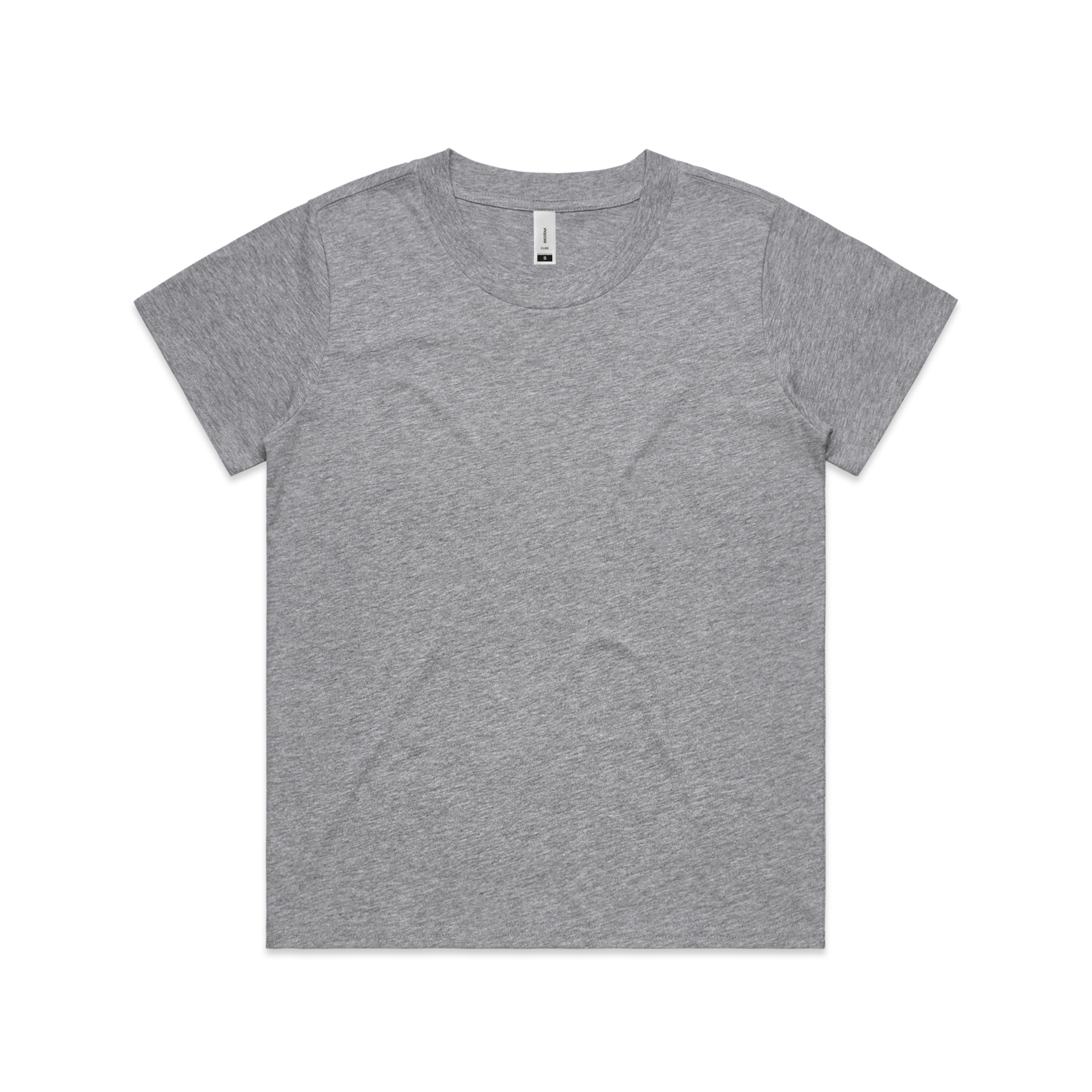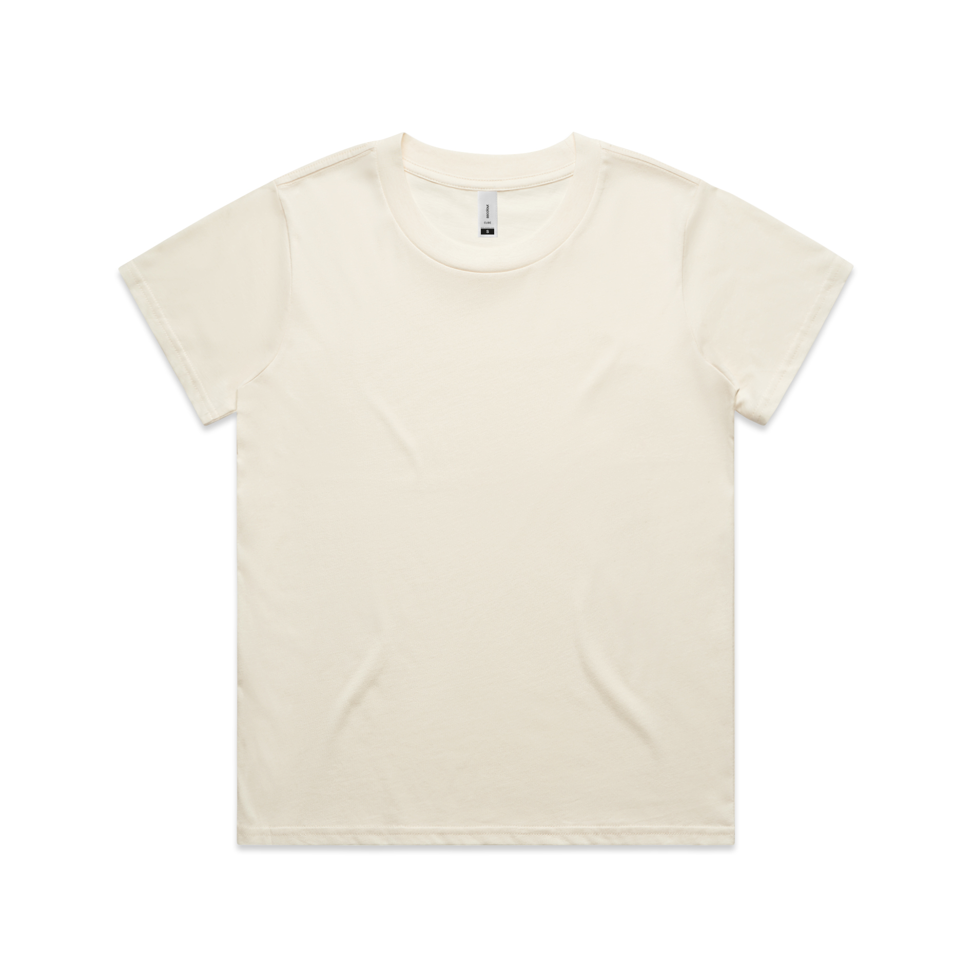 Women’s relaxed fit crew neck tee. Light weight, 150 GSM. 100% combed cotton (marles 15% polyester). Wide neck ribbing, side seamed, shoulder to shoulder tape, double needle hems, preshrunk to minimise shrinkage