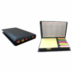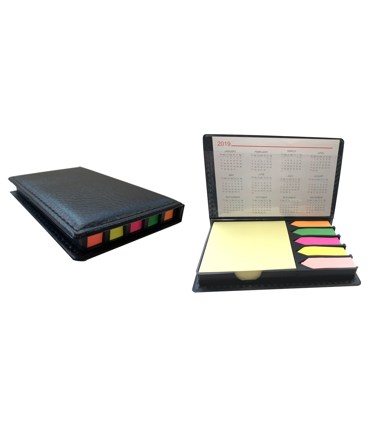 Square PU leather case with sticky notes, flags and pen with calendar.